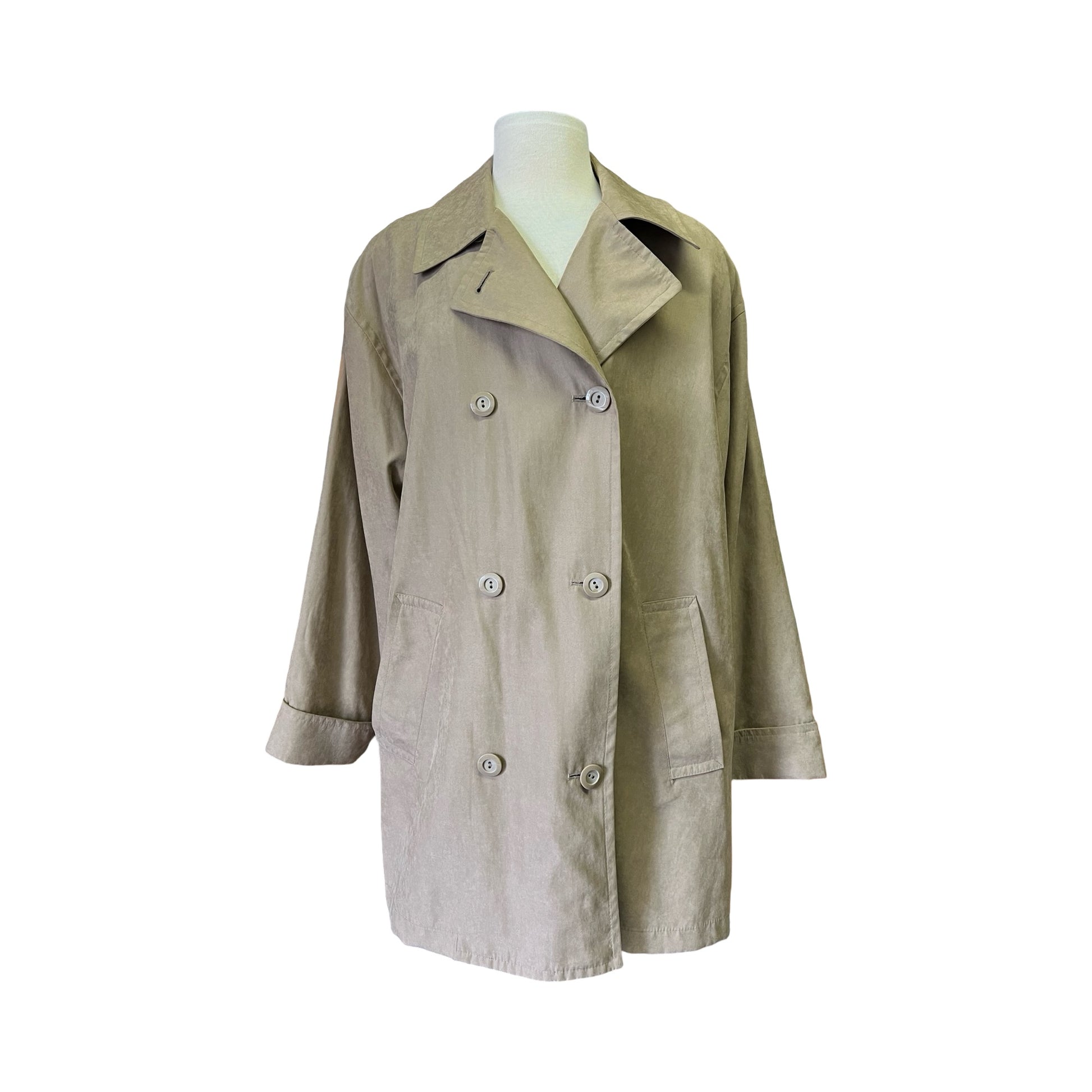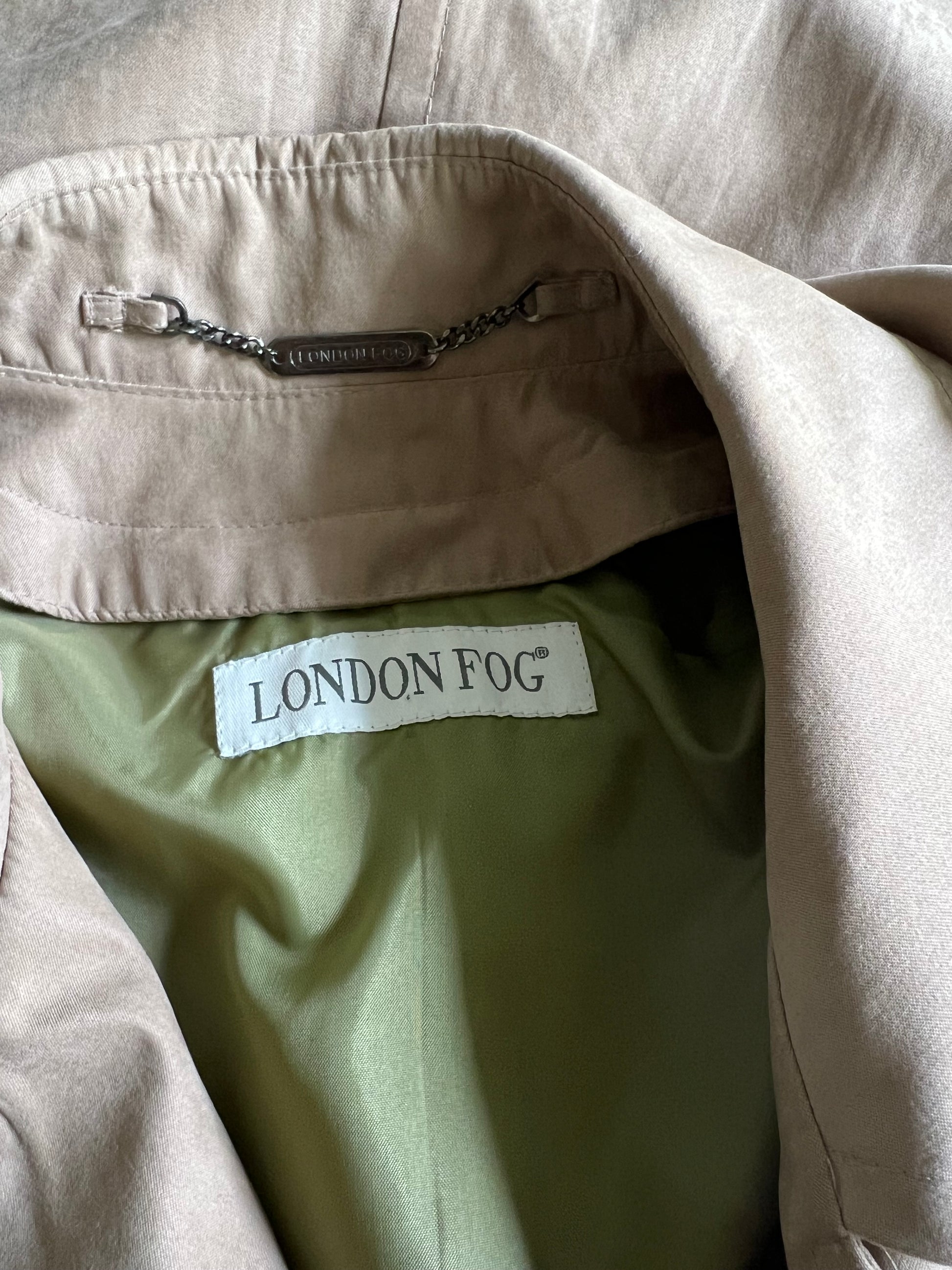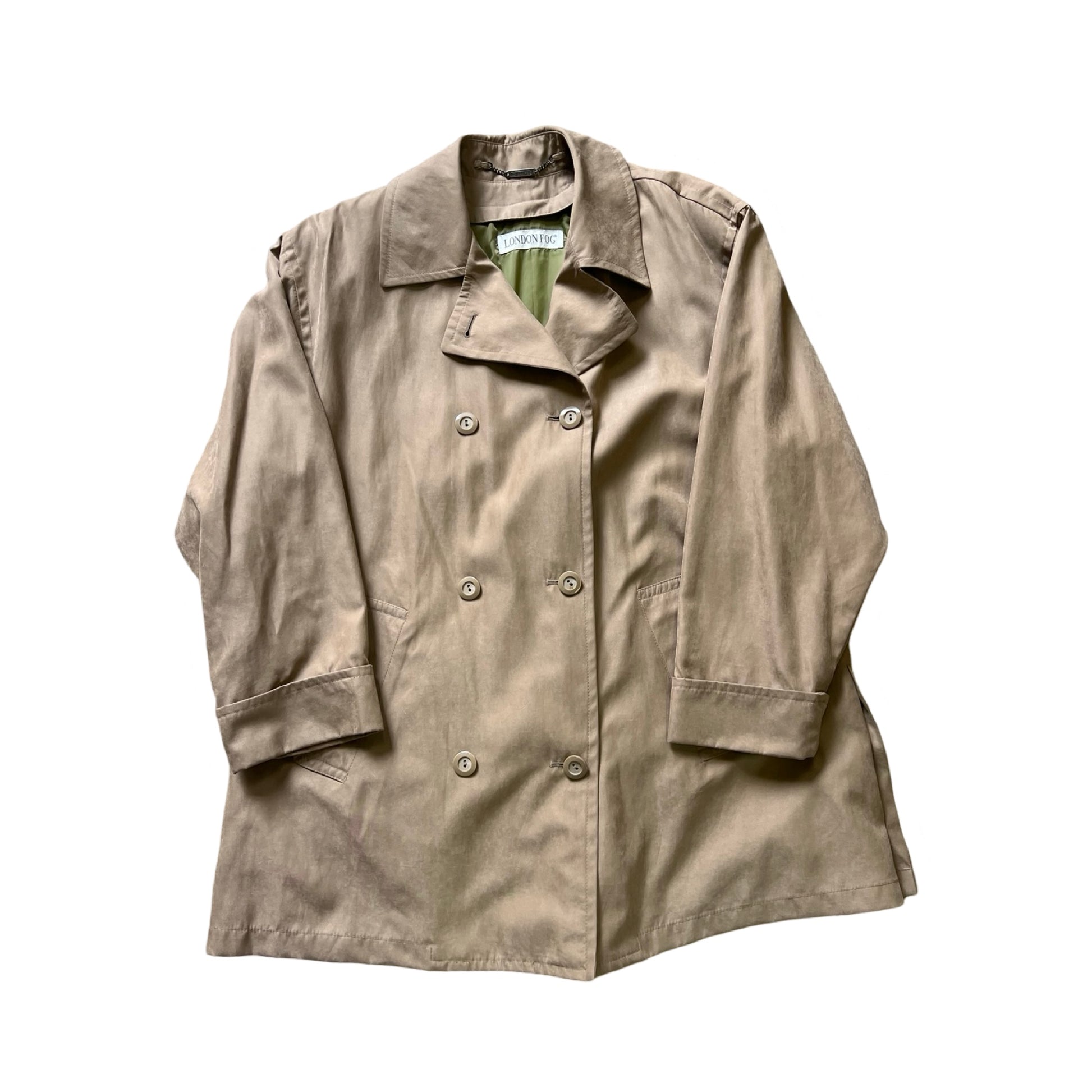 Great double breasted 90’s vintage London Fog trench coat. Super soft material, feels like moleskin. Beautiful drape, oversized silhouette, soft shoulder pads, side button vents, front welt pockets, fully lined. Looks like there was once a zip in liner. Marked a Medium regular but could definitely fit up to 2xl. Measures 23” pit to pit and 33” back of collar to bottom.