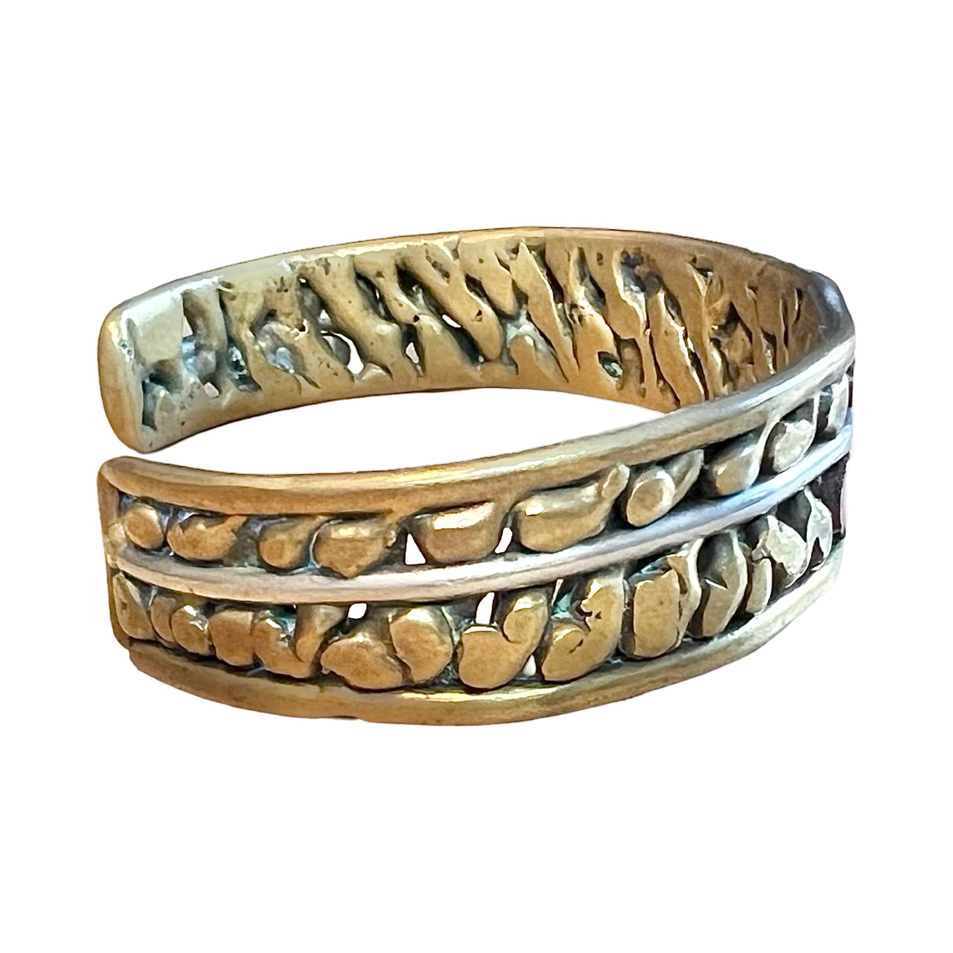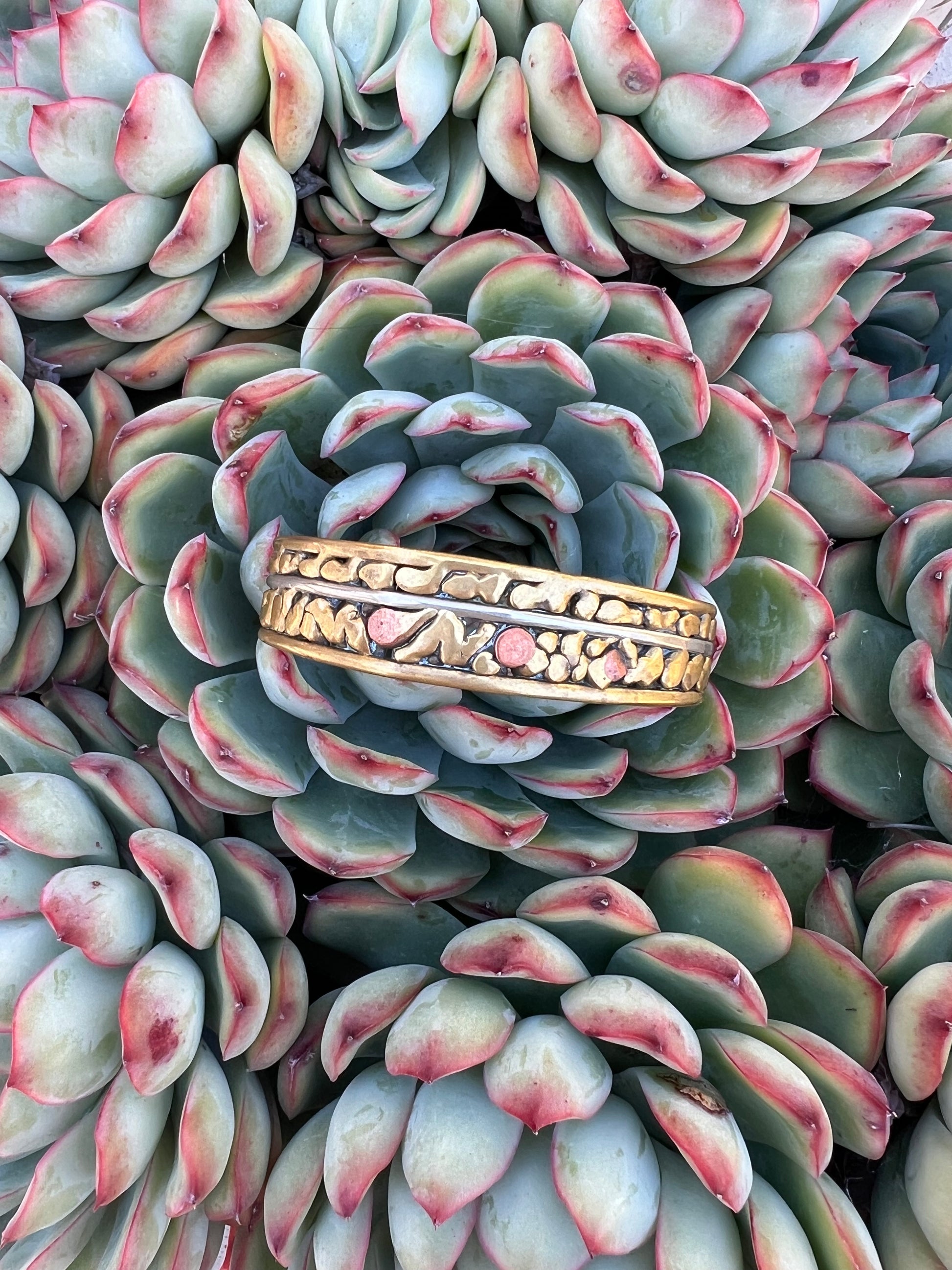 Vintage modernist mixed metal cuff with brass, copper, and silver. Measures 5” in circumference with a 1.25” opening.
