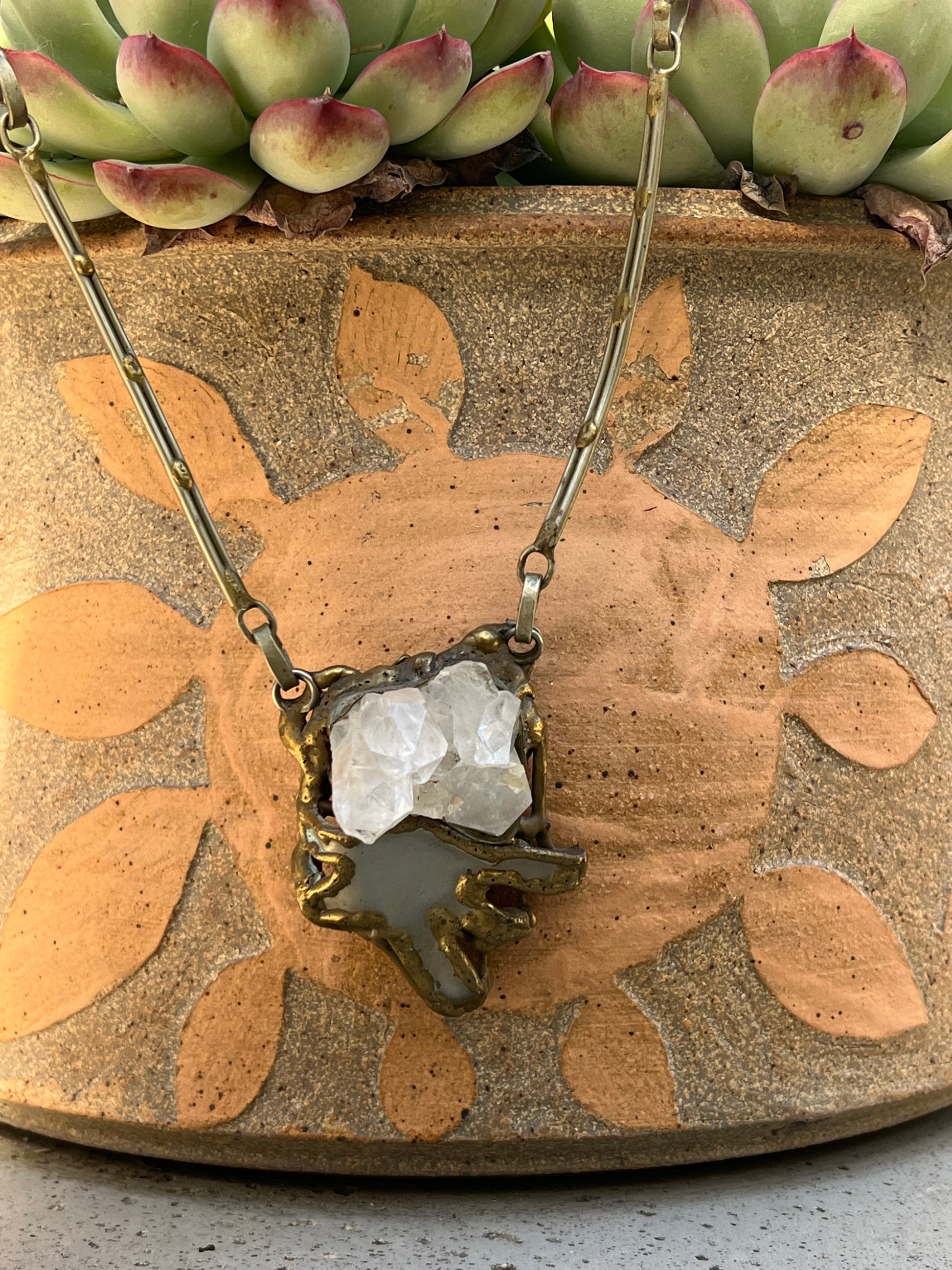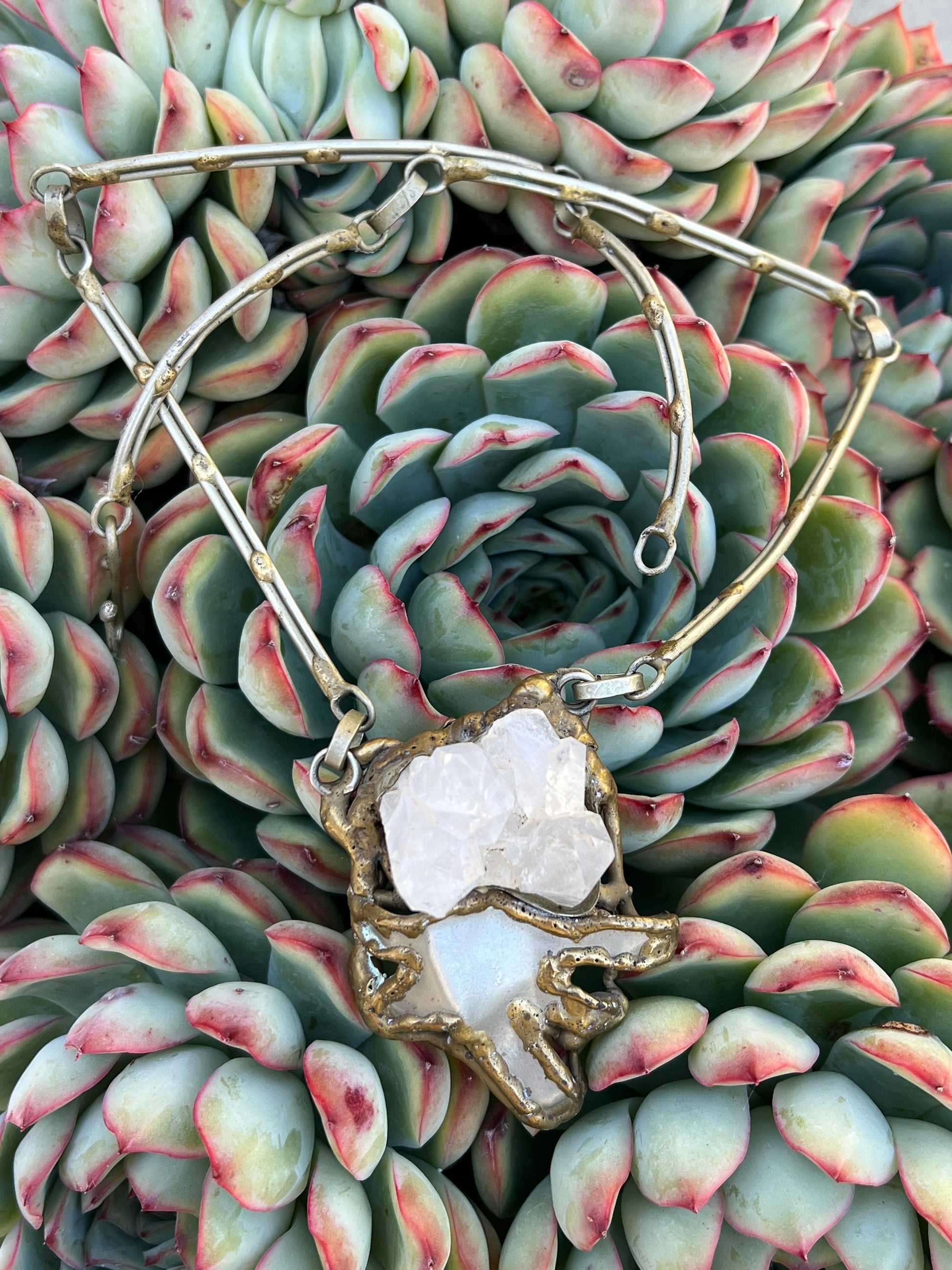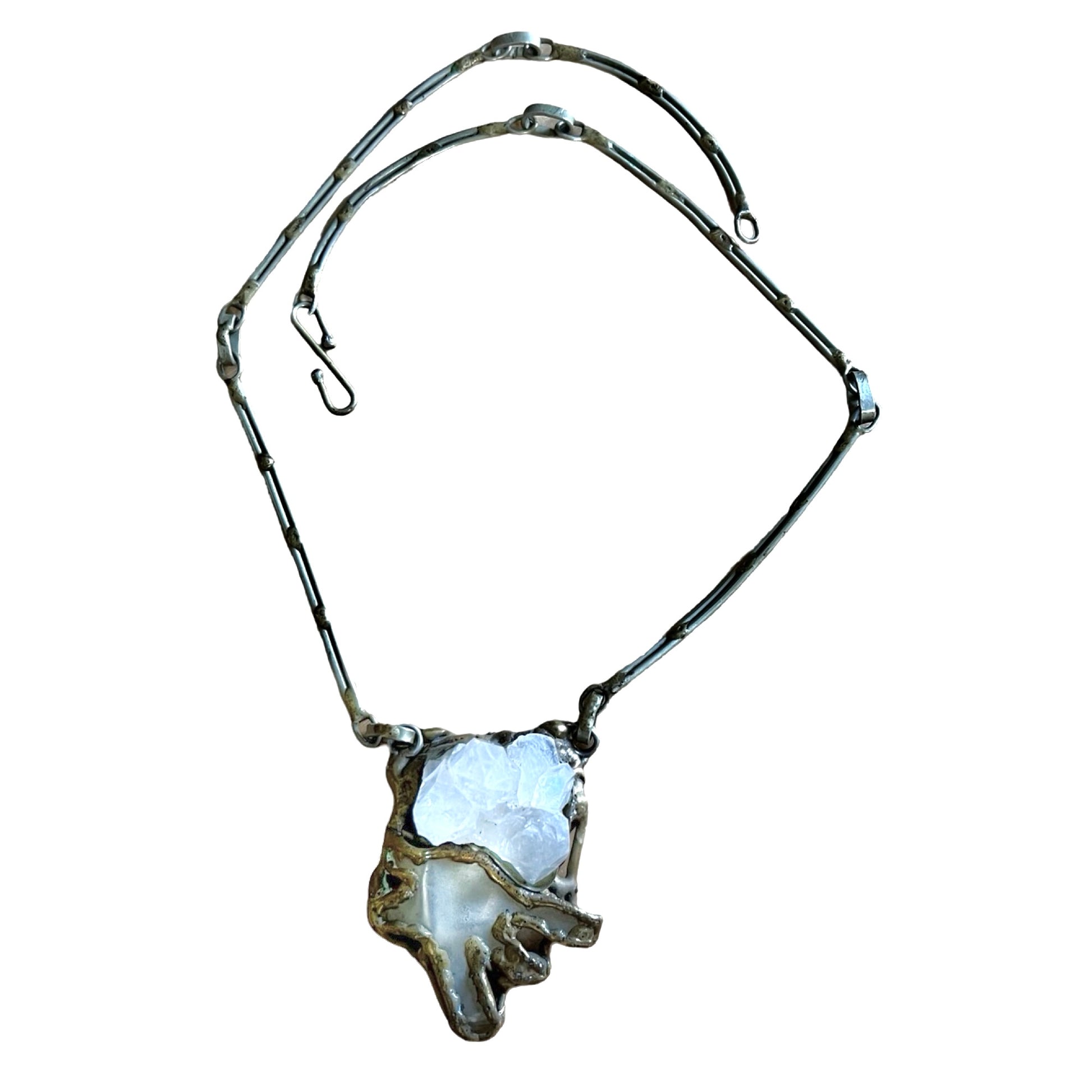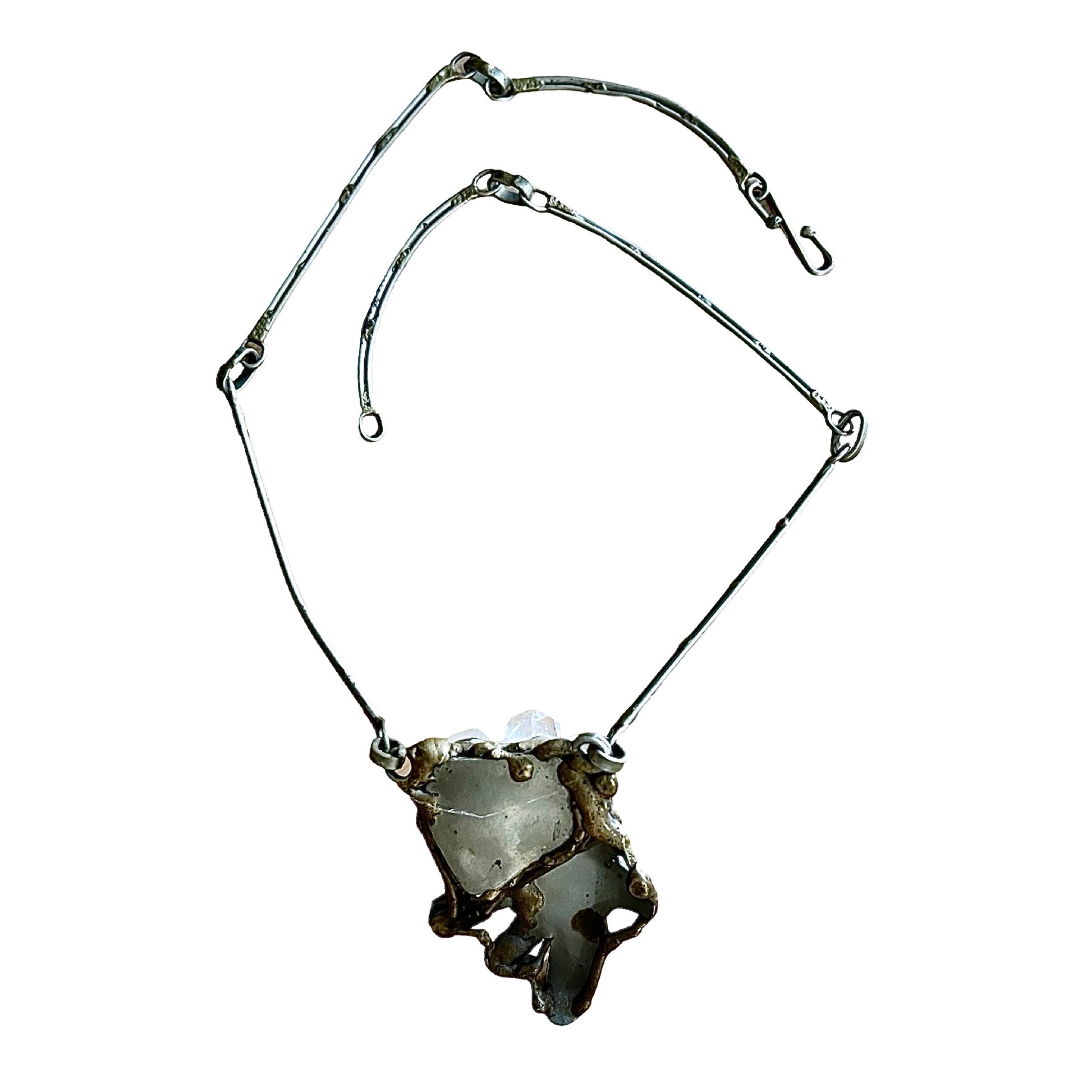 Vintage Modernist Brutalist Crystal Brass Silver Statement Necklace