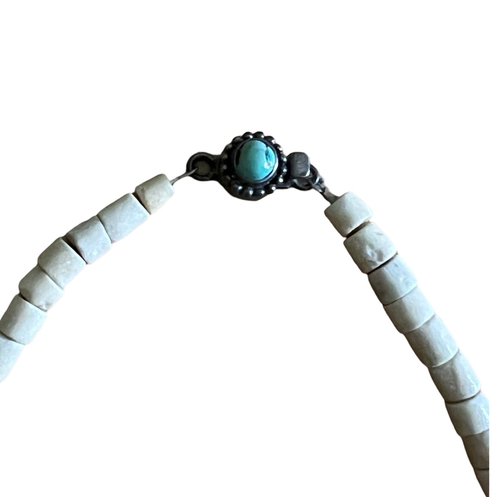Antique vintage Santo Domingo Kewa Pueblo Depression Era turquoise mosaic inlay stone thunderbird over black bakelite with ten graduated triangle accents and a gorgeous sterling silver and turquoise clasp. This necklace is very old and very incredible!! Looks to be some yellowed glue or varnish on body of Thunderbird, but does not detract from the magnificence of this piece. Measures 12” drop to bottom of thunderbird and 21” total length. You might want to restring this as it is very old, but it’s in great vintage condition as is. Info gathered from another seller: During the 1930s when the Depression-era was in full swing, New Mexico Pueblo Indians were severely affected. At Santo Domingo Pueblo (now Kewa Pueblo), the Indians became very resourceful and began producing jewelry from whatever material they could find. One particular folk art creation they produced has become a very collectible item: the Depression-era necklace. Production continued at a lesser rate into the mid-20th century.