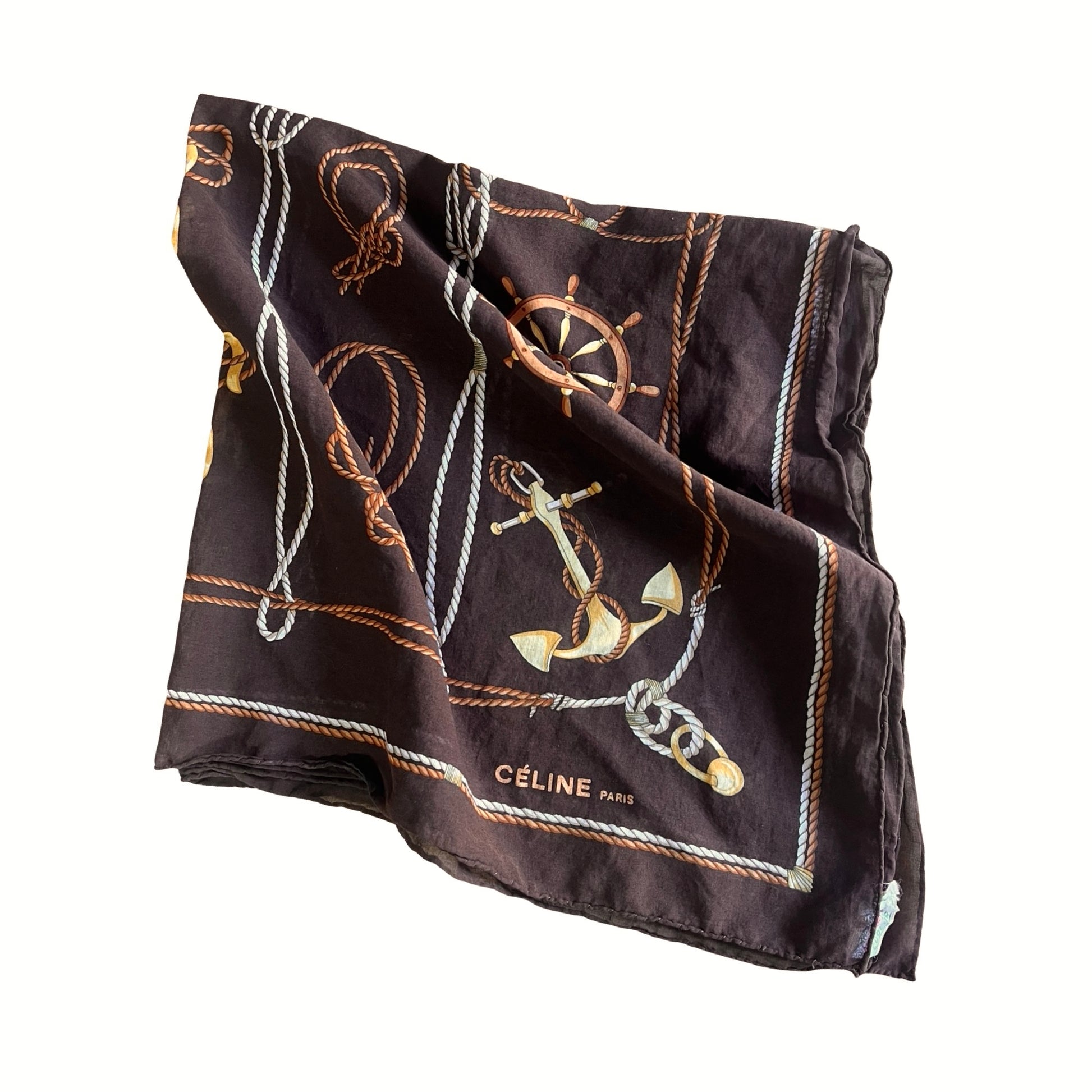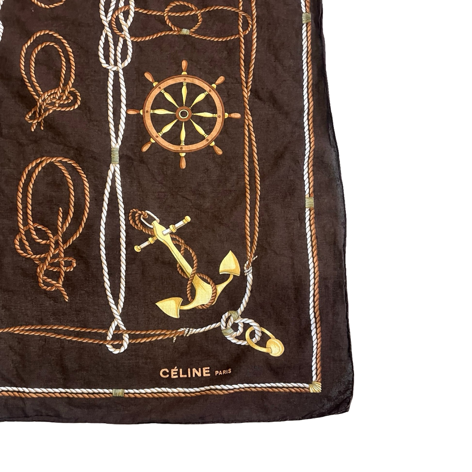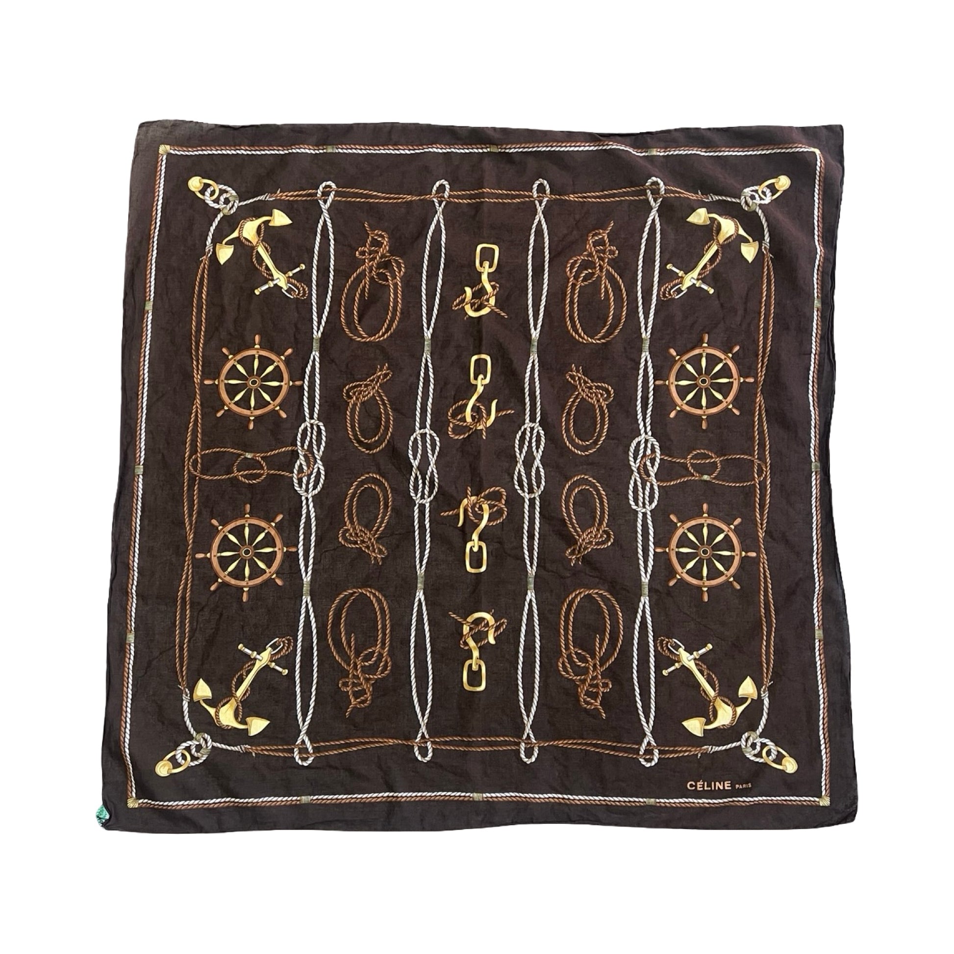 Beautiful rare print on this vintage Celine scarf. 100% cotton with original label attached. Nautical theme features anchors and rope in a gorgeous earth tone brown and gold colorway. Measures a generous 31” x 31”. Machine washable & durable.