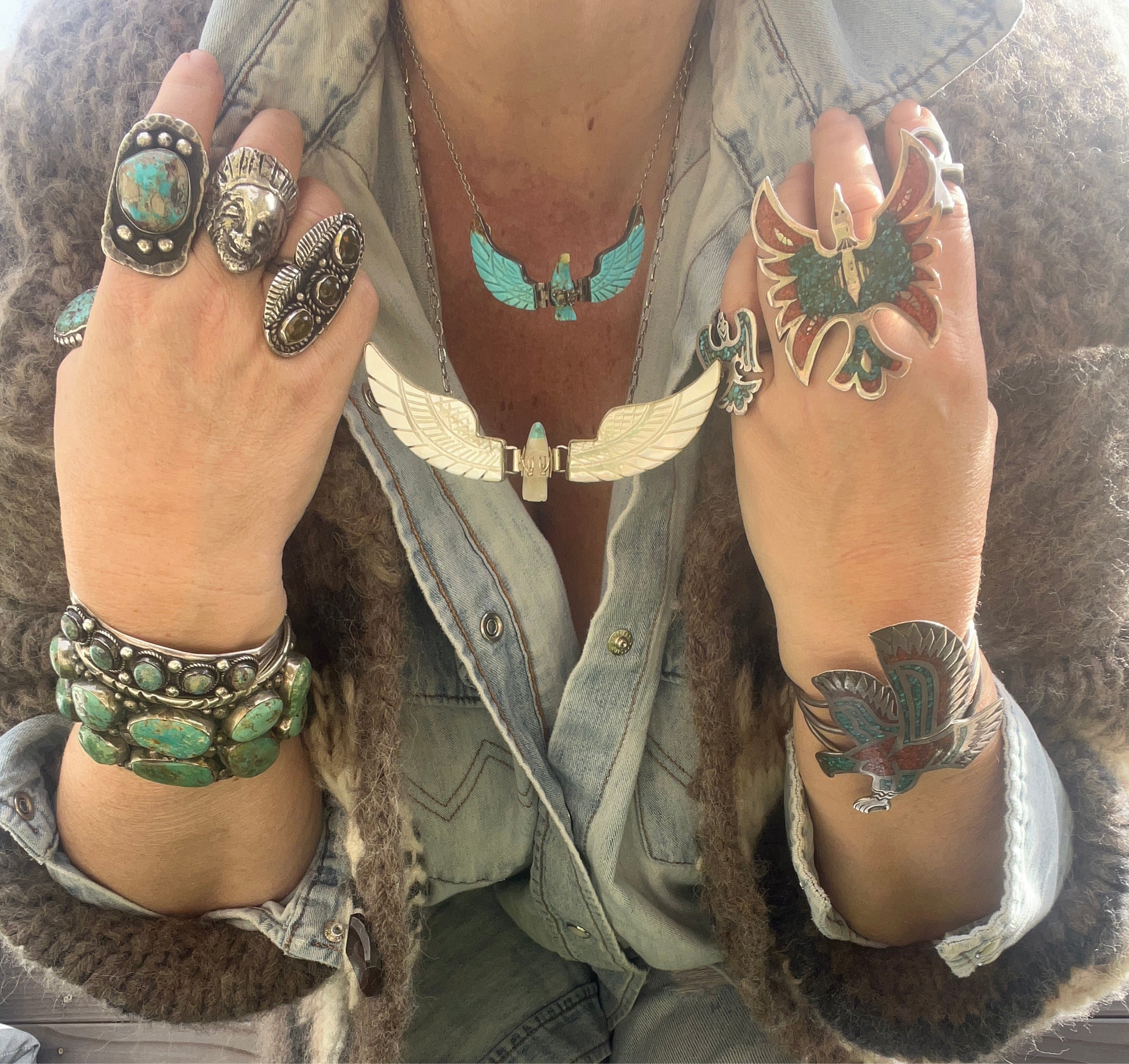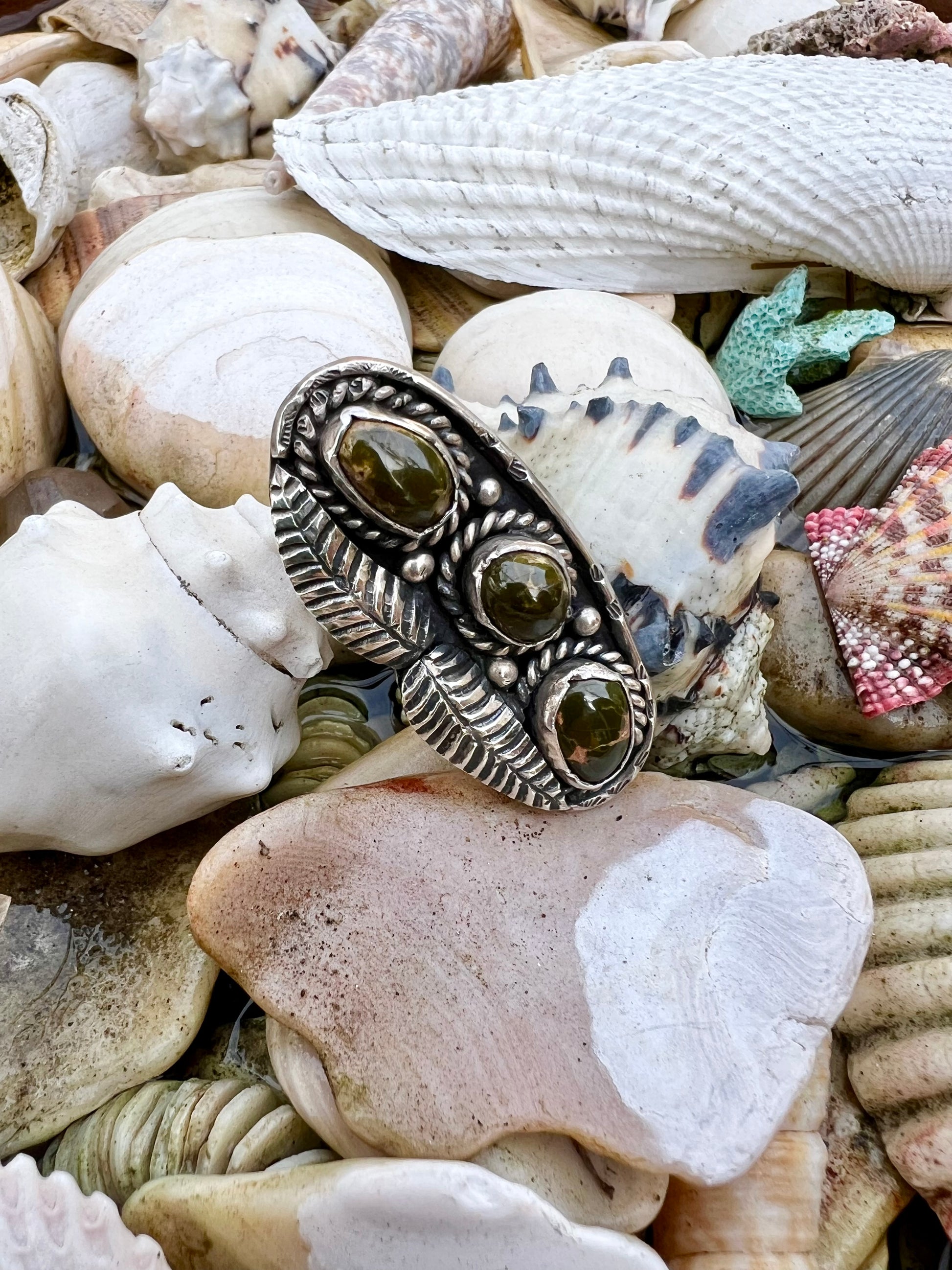 Beautiful green turquoise stones on this vintage Navajo sterling silver ring with intricate leaf design. Hallmark on back reads AZ7BB, ring measures 2” tall by 1” wide and is a size 8.