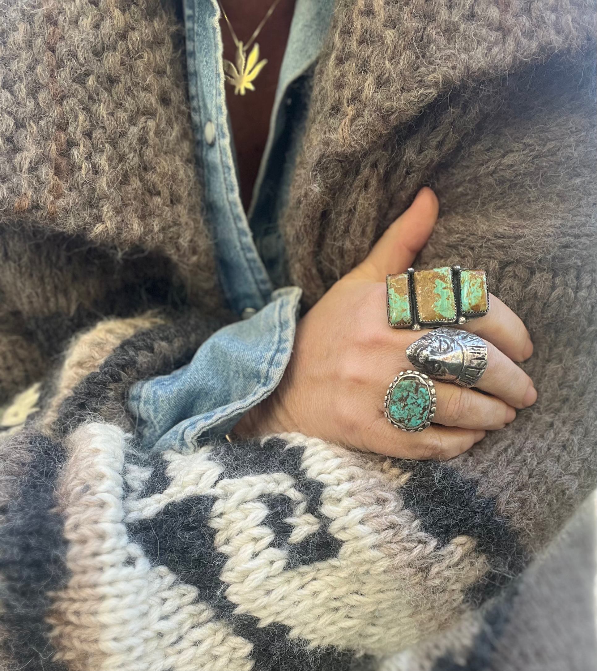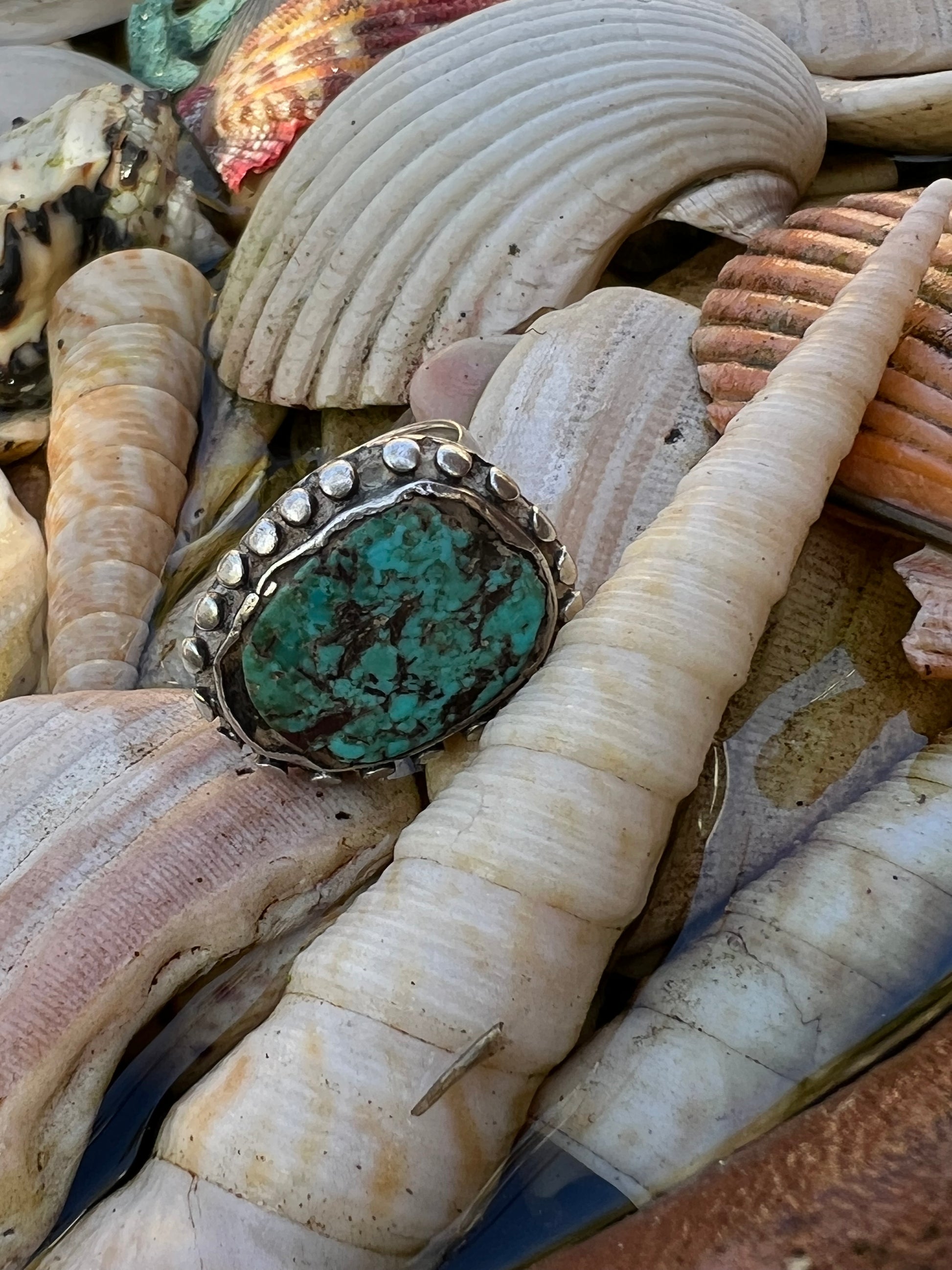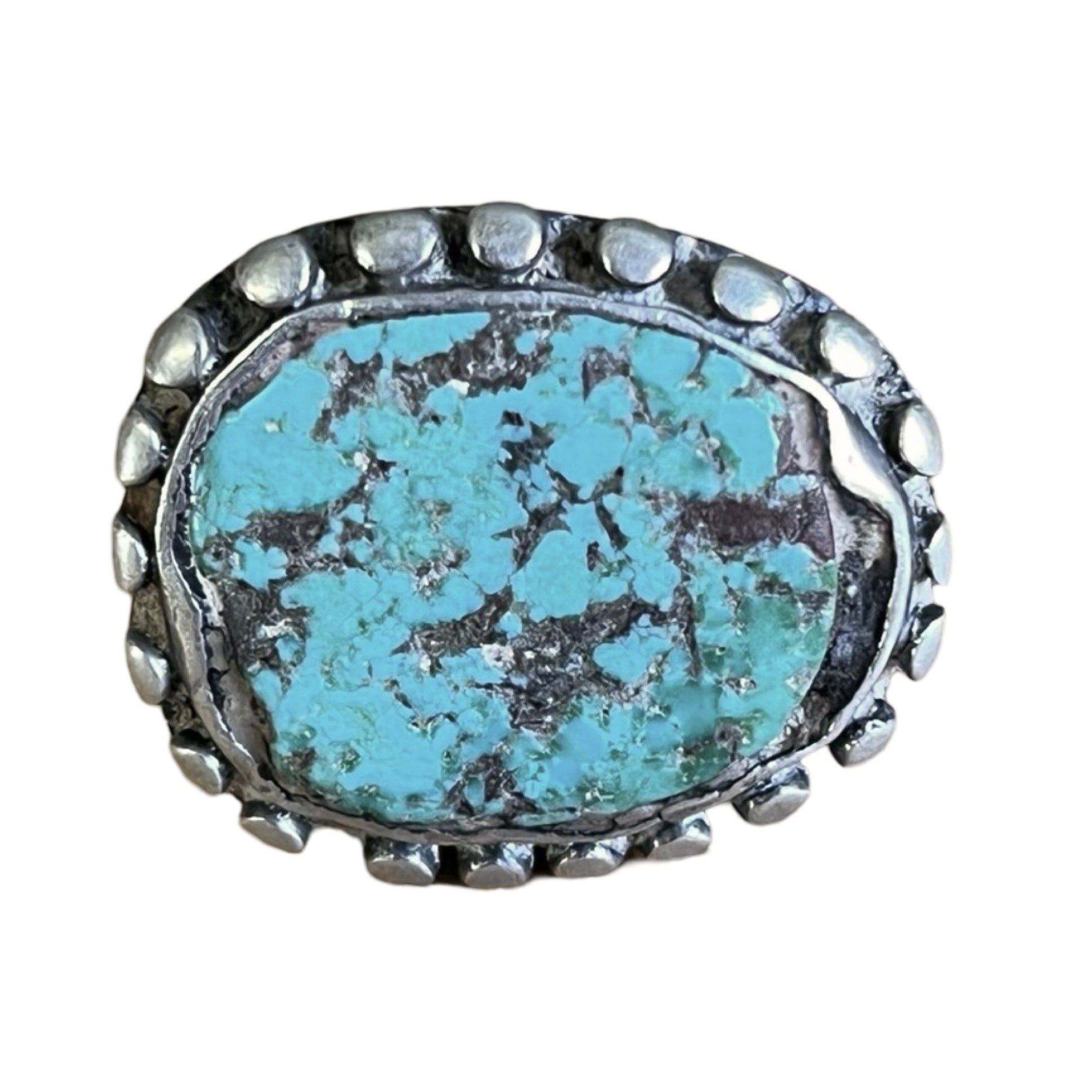 Simple and beautiful vintage Navajo turquoise and sterling silver ring. Nice unpolished natural stone with silver beadwork all around. Measures 1” wide by 3/4” tall size 8.5.