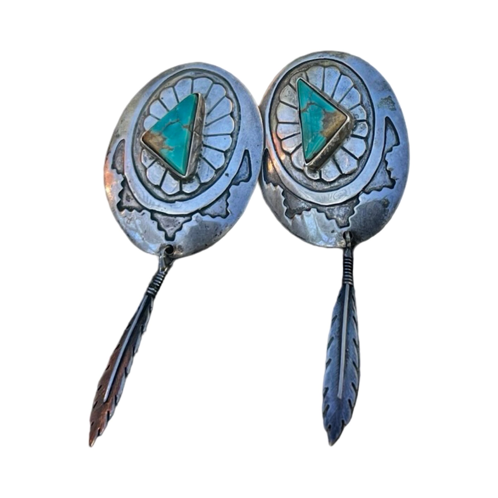 Beautiful vintage Navajo sterling silver and turquoise earring with dangling feathers. Measures a dramatic 3” in total length. Post back. Hallmark JN or JZ.