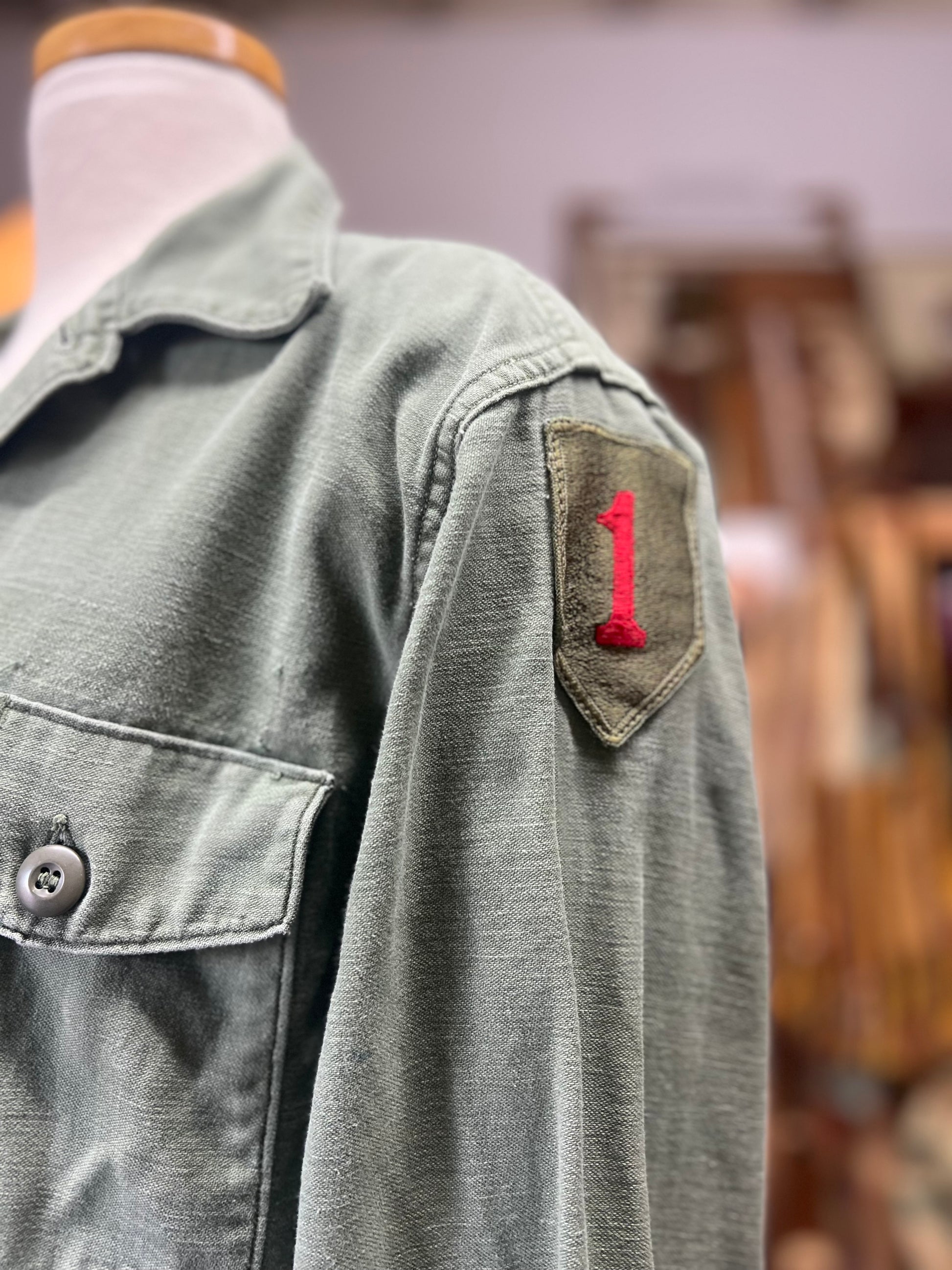 It’s really hard to find these vintage OG 107 Army jackets in bigger sizes. This one is perfectly faded to that coveted shade of green and features a number 1 patch of the left shoulder. In great shape (only missing top button) and freshly laundered. Measures 24” pit to pit and 29” base of collar to bottom.