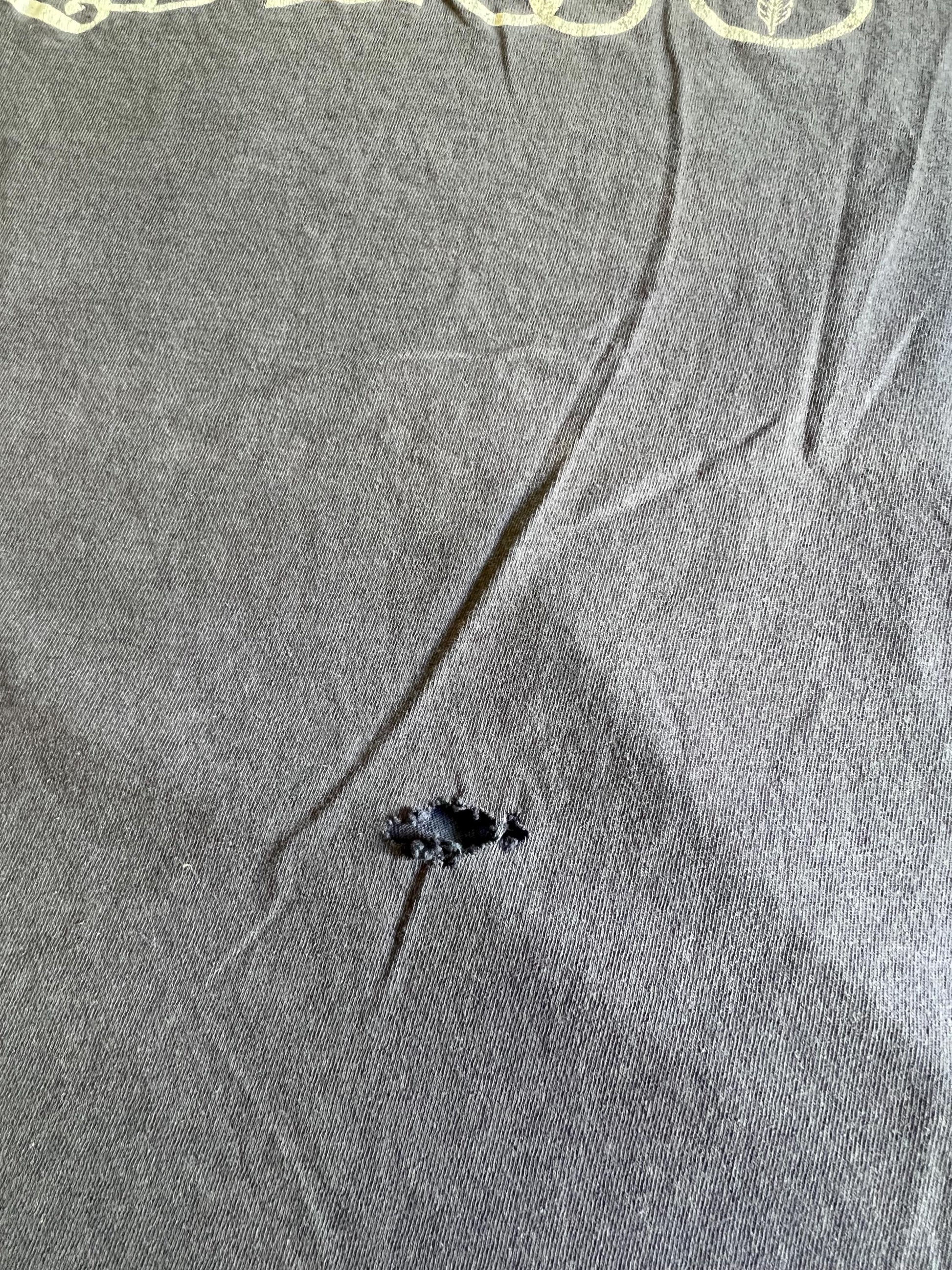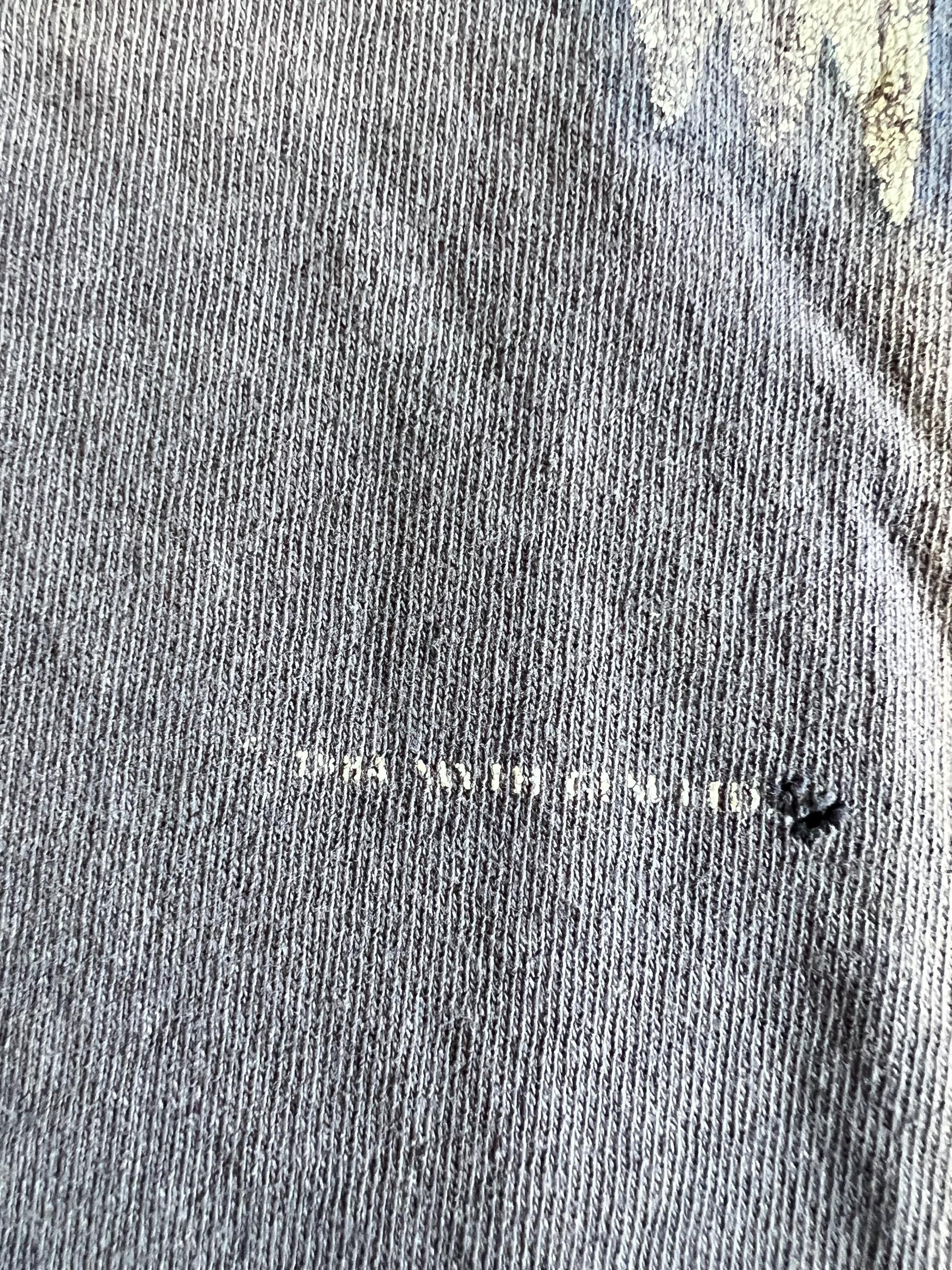 Vintage original two-sided 1984 single stitch Led Zeppelin t-shirt with Swan Song front graphics & Zoso back graphics. Super distressed with a couple large holes and smaller ones throughout, sun faded stripe down front, soft, thin, well worn and faded. Nice collectors piece, rare front & back graphics. Hanes tag reads XL and measures 21” pit to pit and 24” top to bottom.