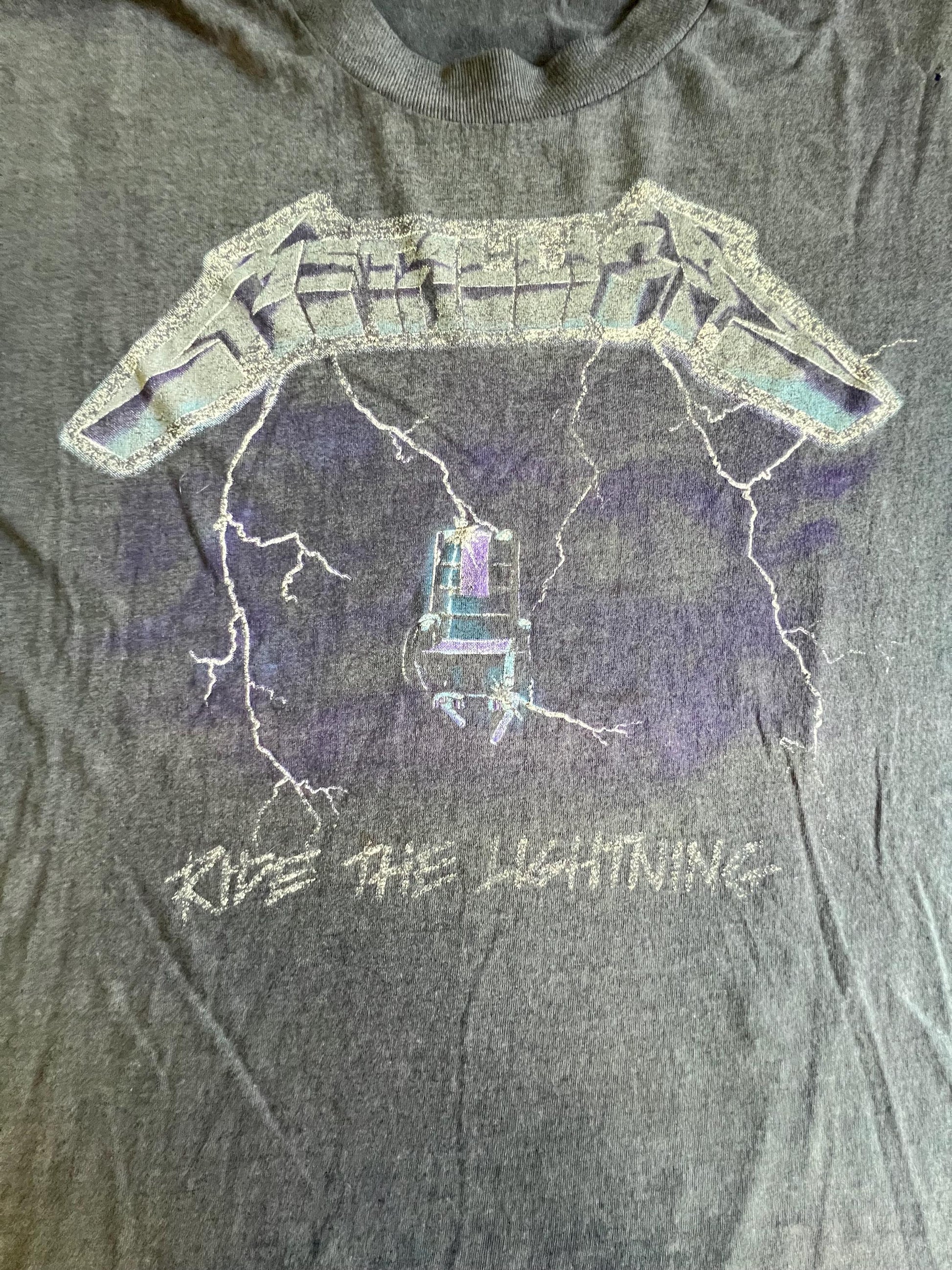 Vintage original 1987 Metallica two sided Ride The Lightening tshirt. Soft, thin, well worn and faded with some holes in the back and bottom hem separation. Measures 21” pit to pit and 25”’top to bottom.