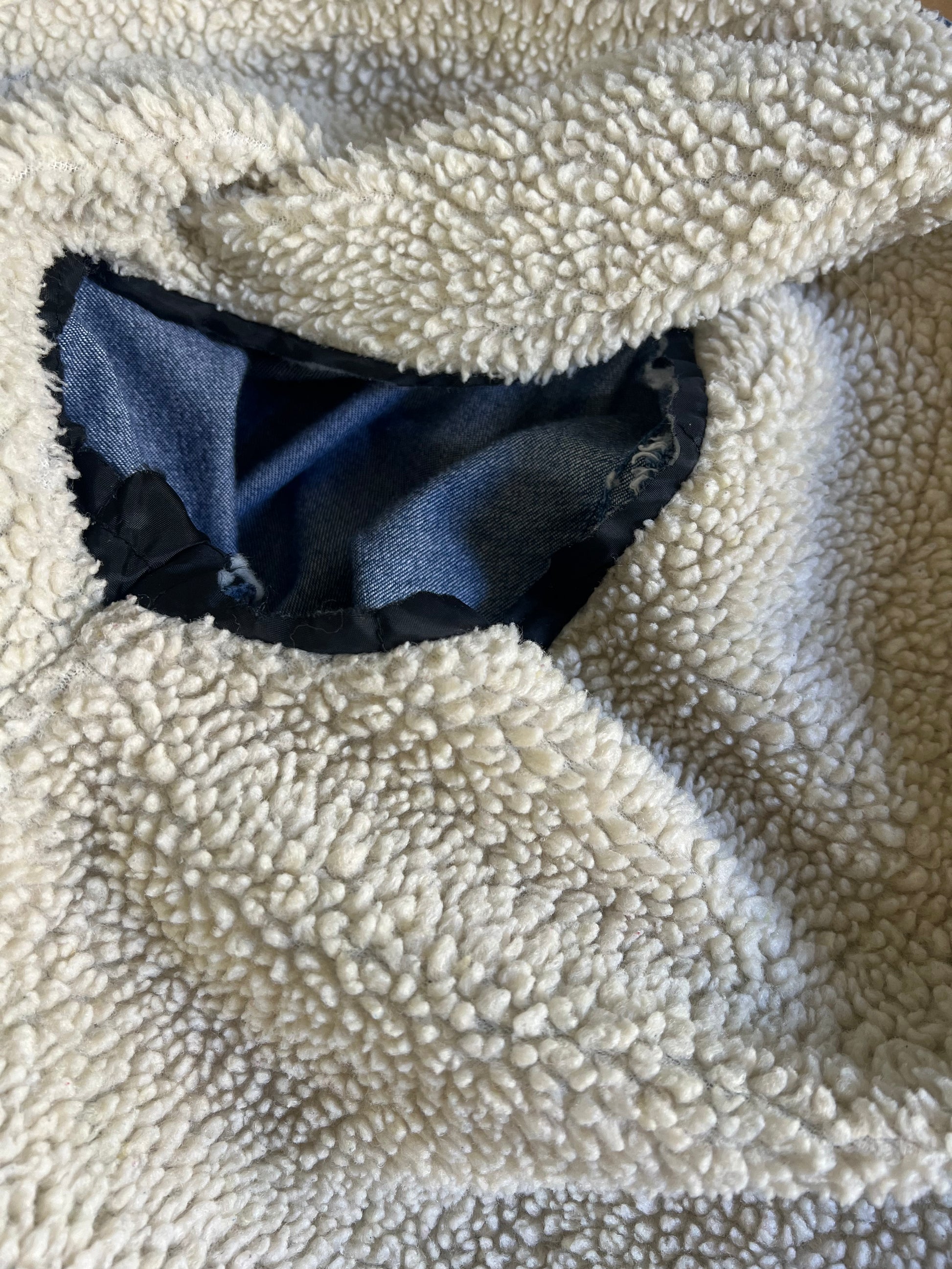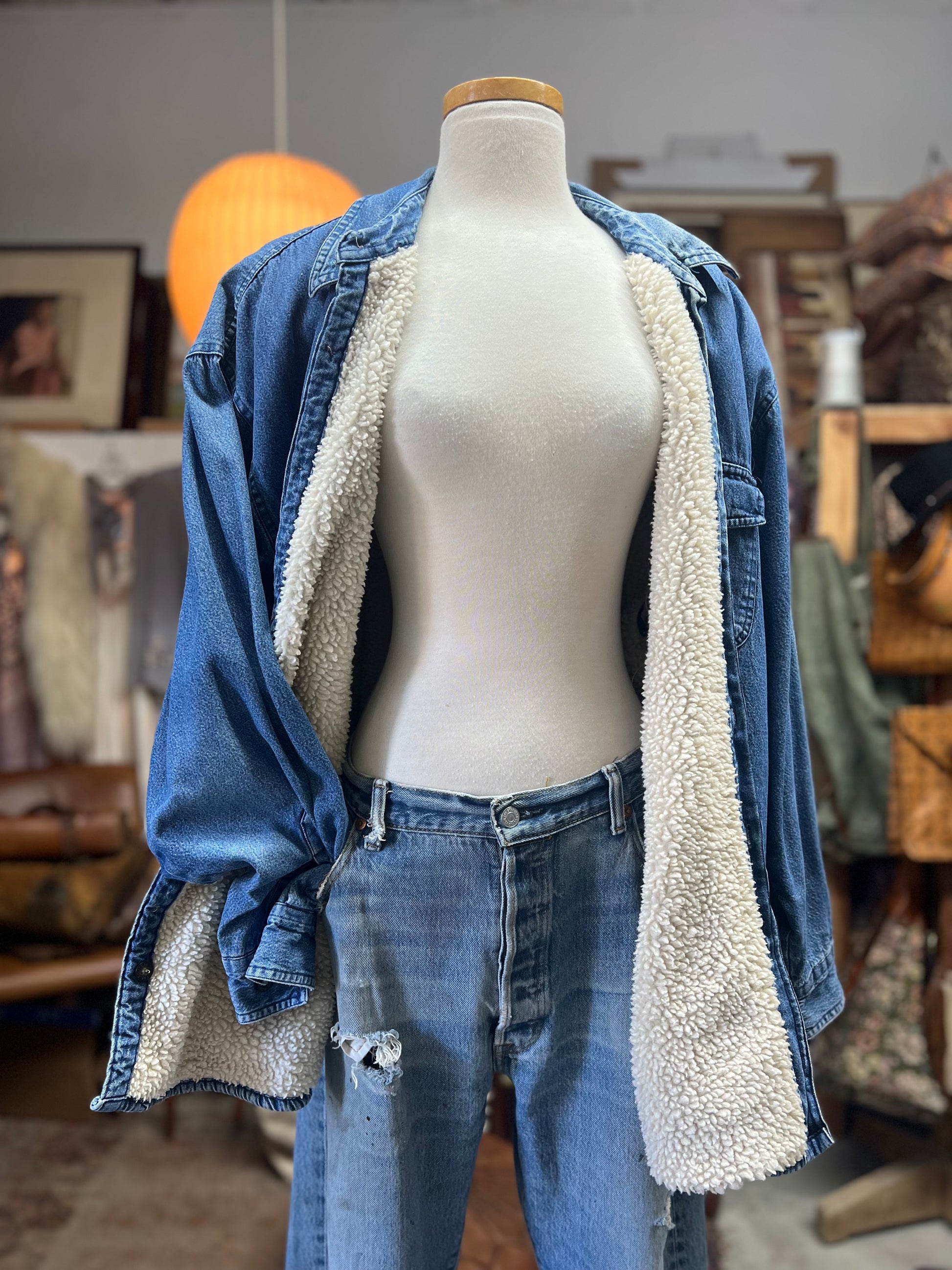 Such a great layering piece! Vintage 80’s Route 66 denim and sherpa lined shirt jacket. Button front, two button chest pockets, slight shirttail hem. The sherpa lining has been cut out of the sleeves (and not by a professional) for a more comfortable/less bulky fit. No size tag, measures 27” pit to pit and 31” top to bottom.