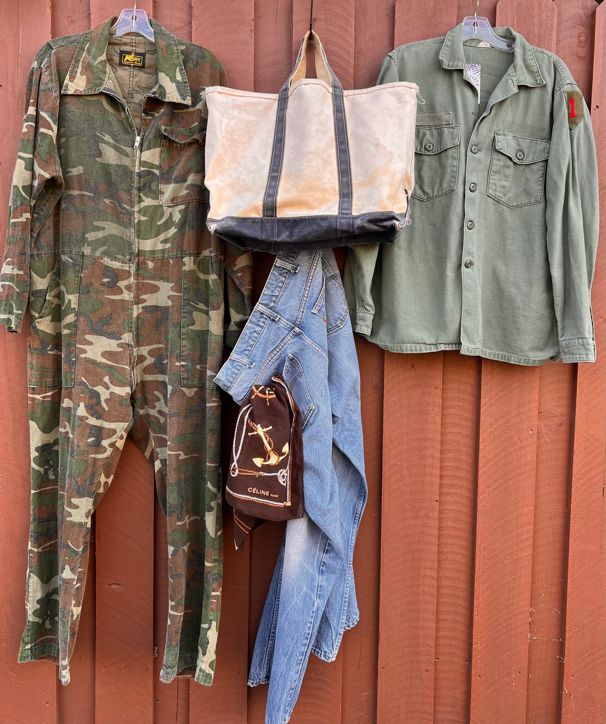 This will be your new favorite jumpsuit, worth every penny cuz you’ll want to live in this! Thin, lightweight, soft, well worn and beautifully faded with a two-way zip front in a roomy size XL. Two front pockets and one back patch pocket. Adjustable waist snaps for tighter fit. Old school KMart label. This jumpsuit is one of the best in my collection!! Measures 28” pit to pit, 28” inseam (slight drop crotch), torso measures 36.5” base of back collar to bottom of zipper. In amazing vintage condition.