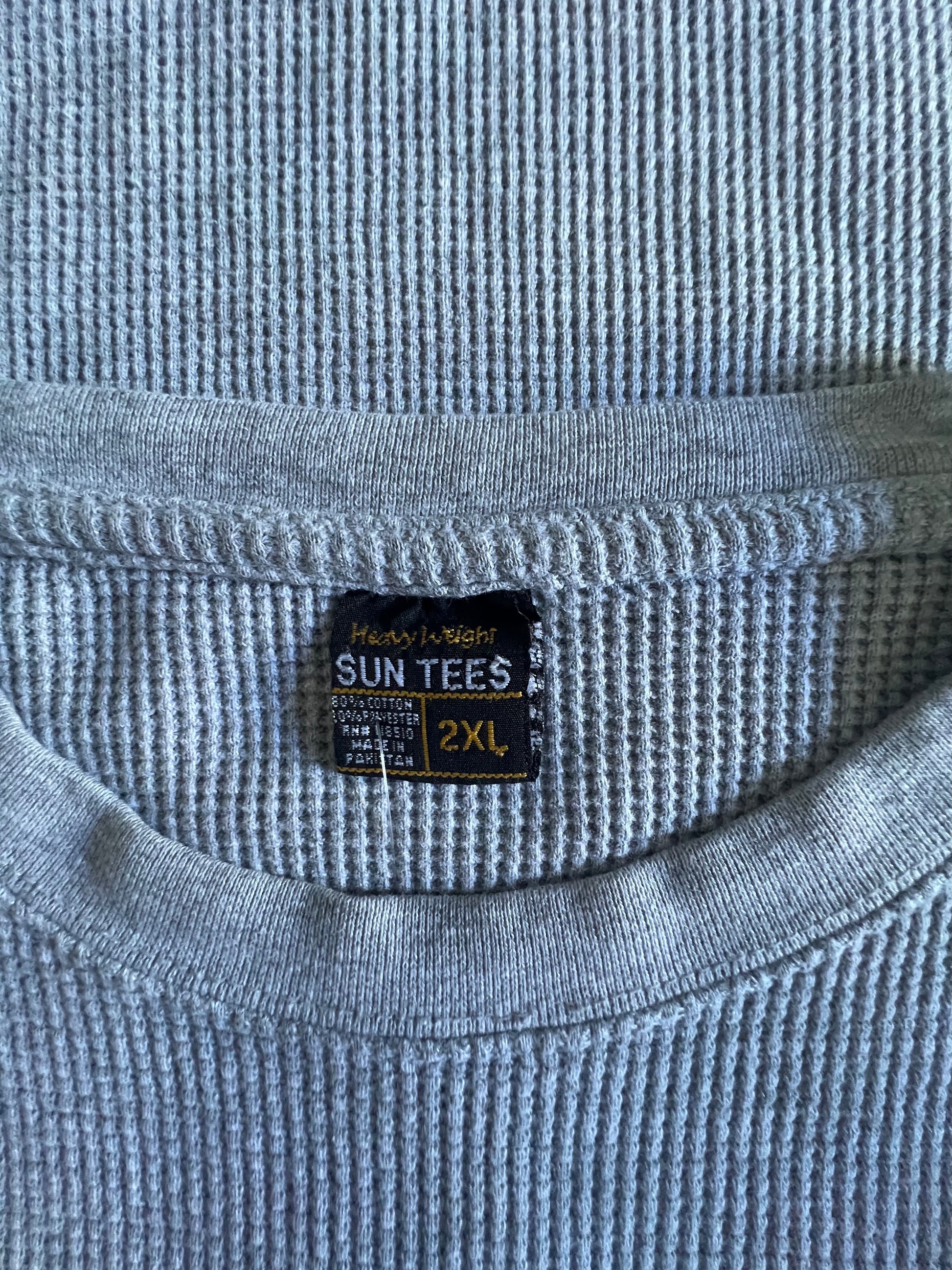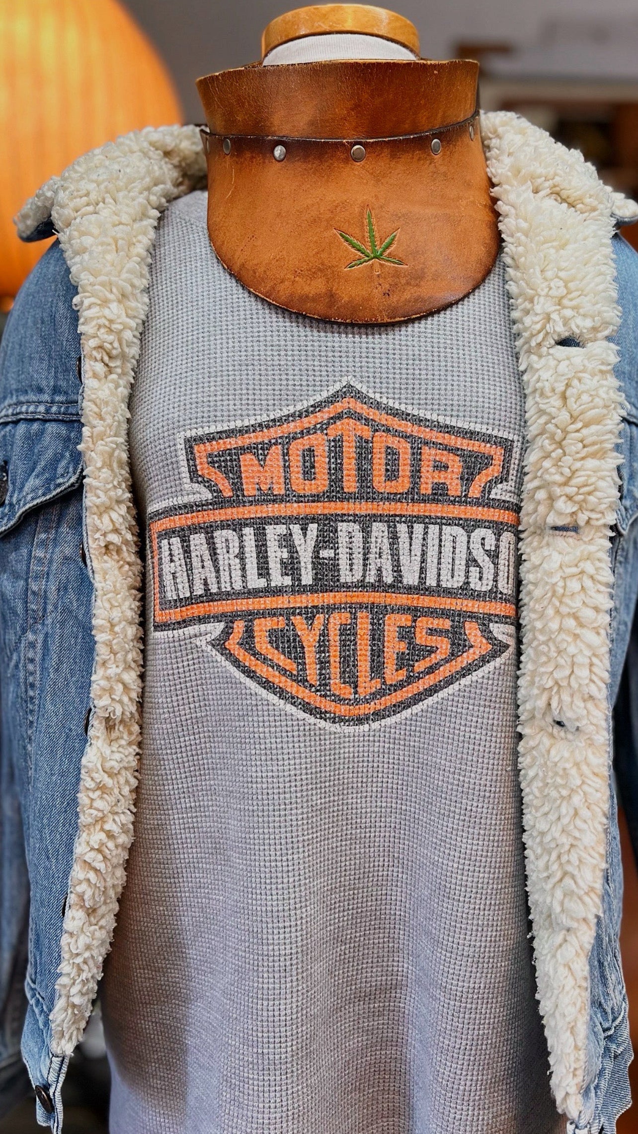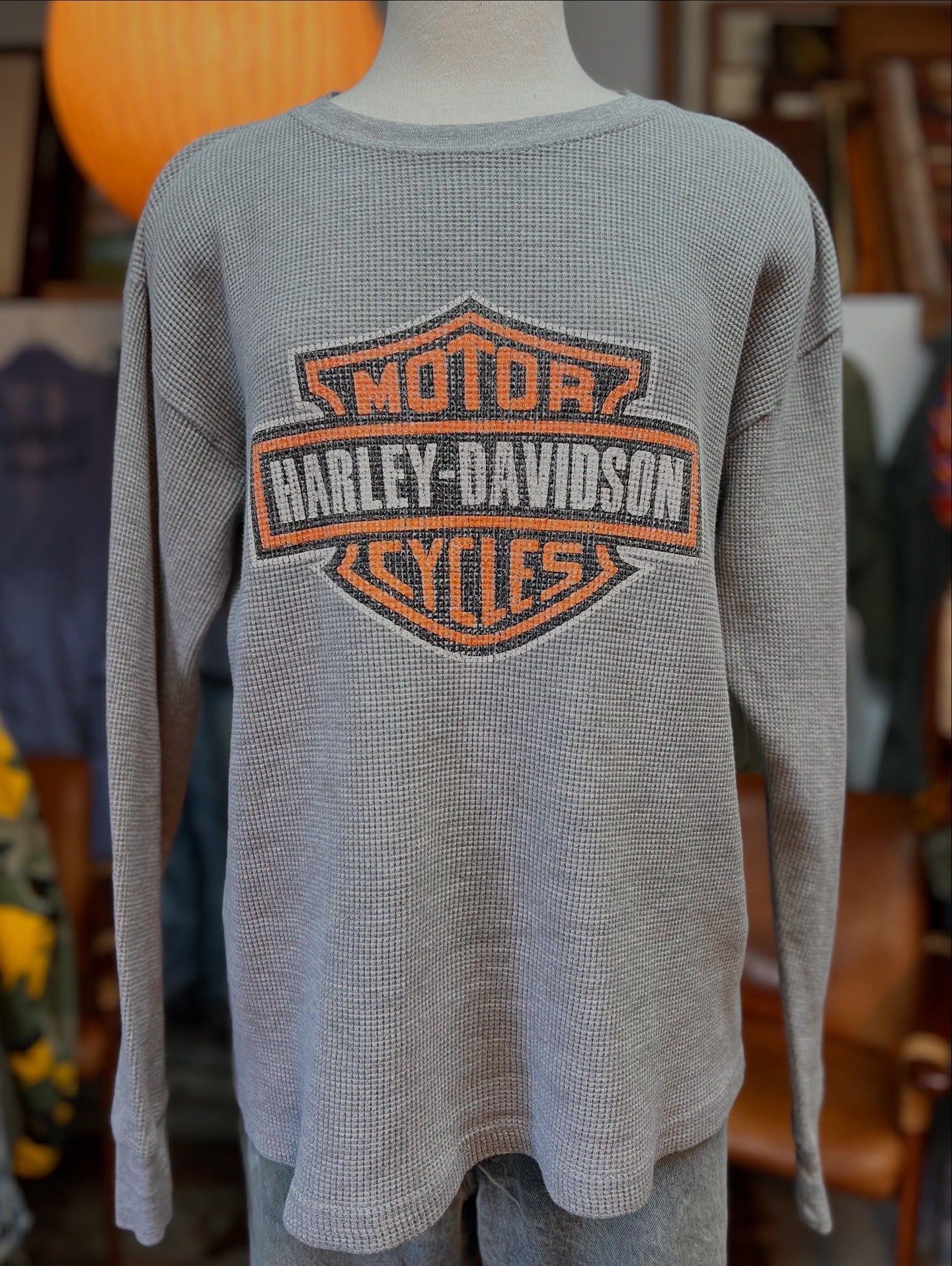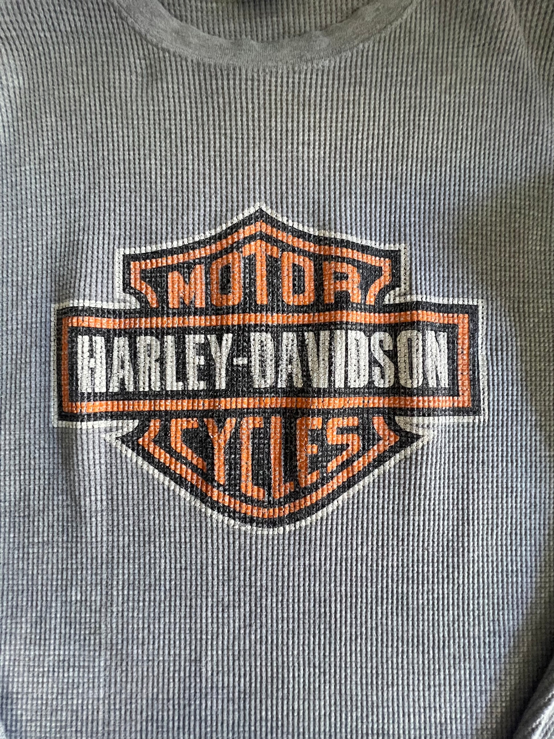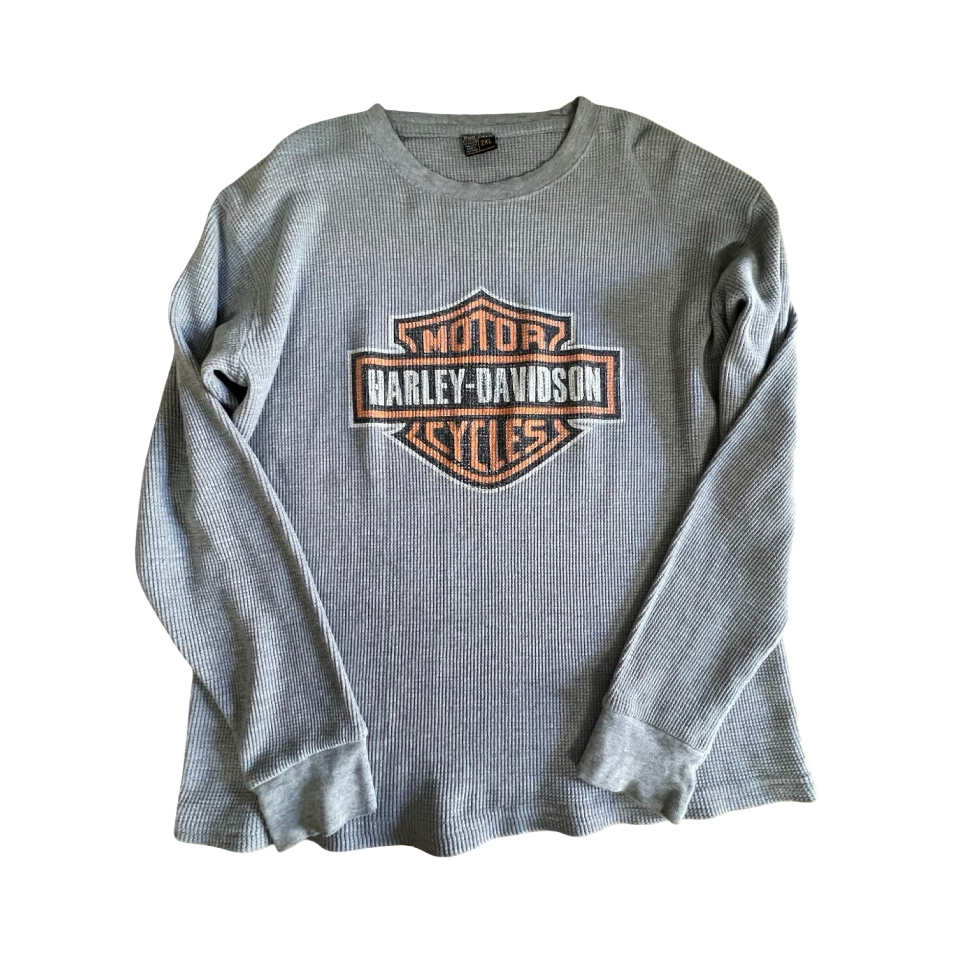 Vintage bootleg Harley thermal in a hard to find bigger size. Faded front graphics, clean back, soft and broken in. Tag reads 2XL but fits more like an L/XL. Measures 22” pit to pit and 26” top to bottom.