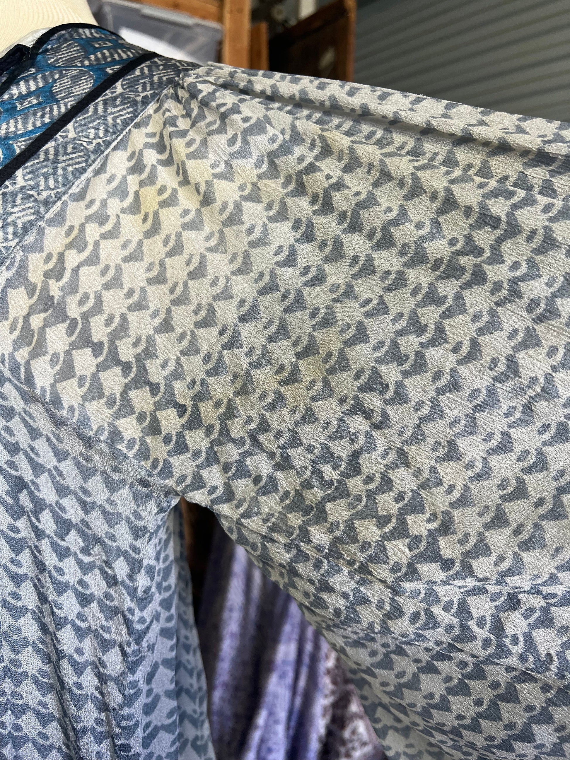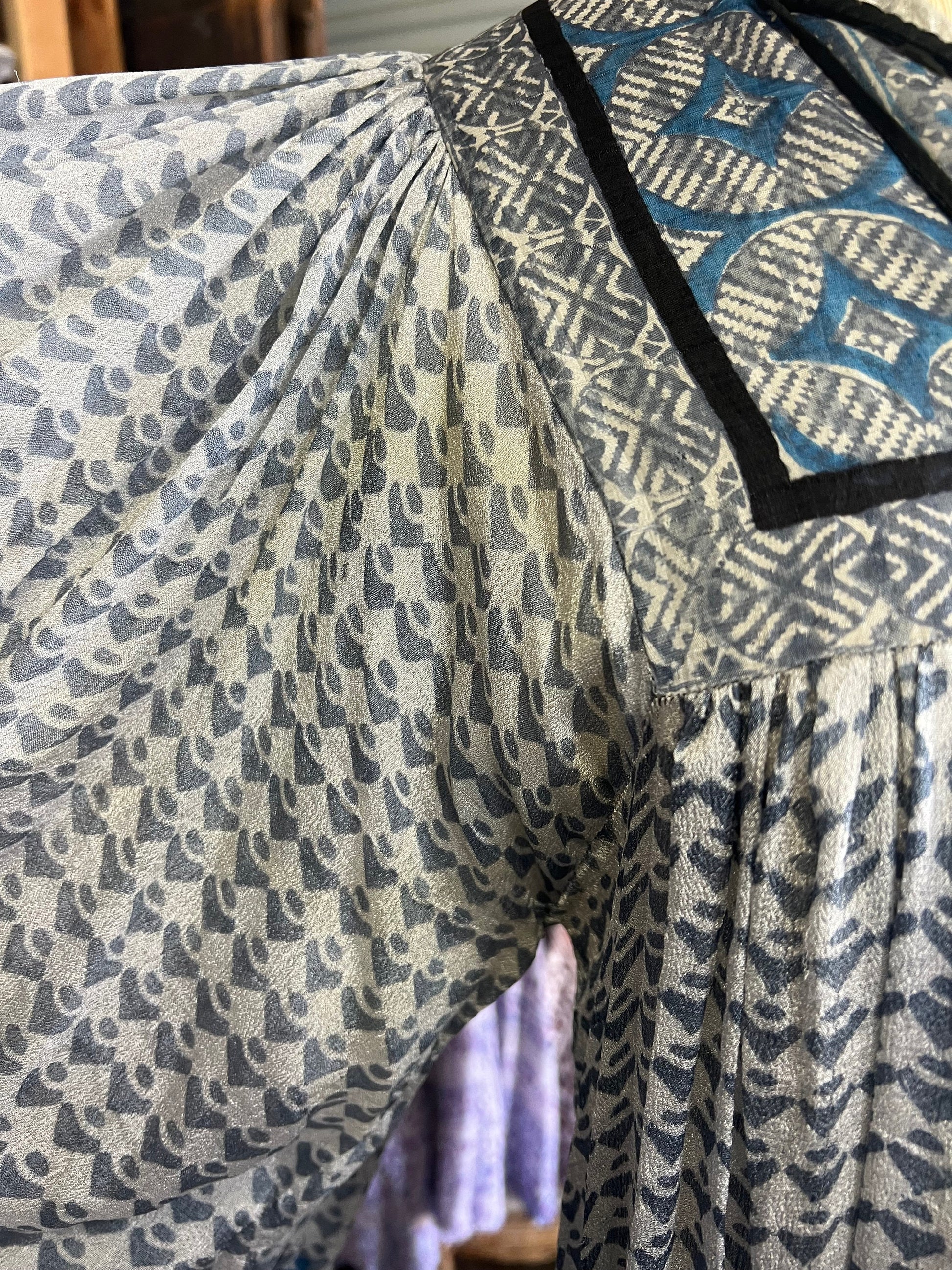 This dress is an absolute unicorn! Ritu Kumar for Monsoon 100% silk dress features India block print, huge dramatic angel sleeves, and a flowing ethereal body. She has some flaws which is to be expected for a silk dress of this age….some