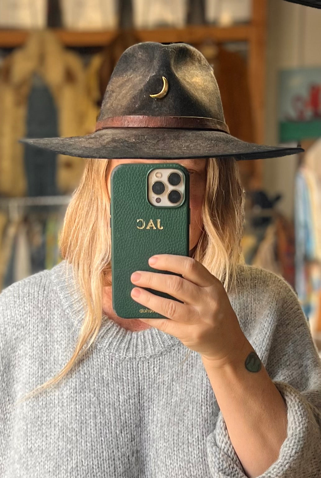 Custom Sam Roberts LA Vintage hat with crescent moon pin and vintage distressed leather hat band. Amazing one of a kind beauty.