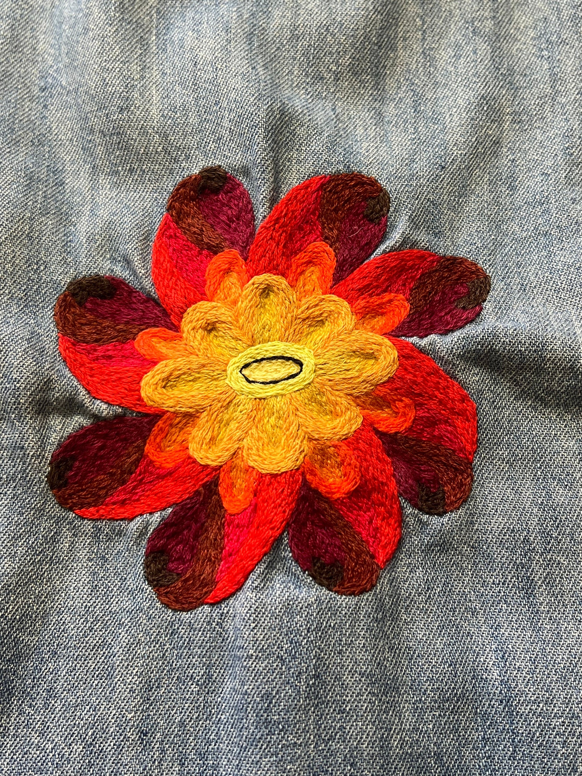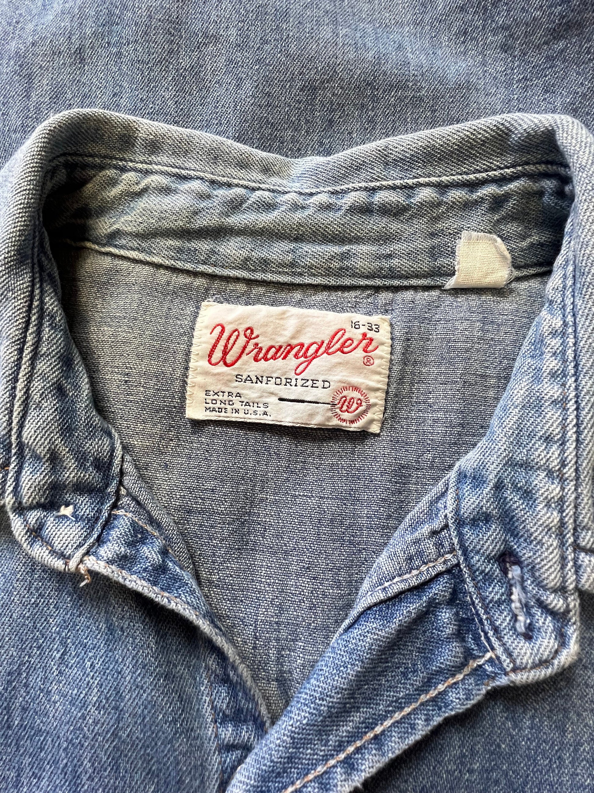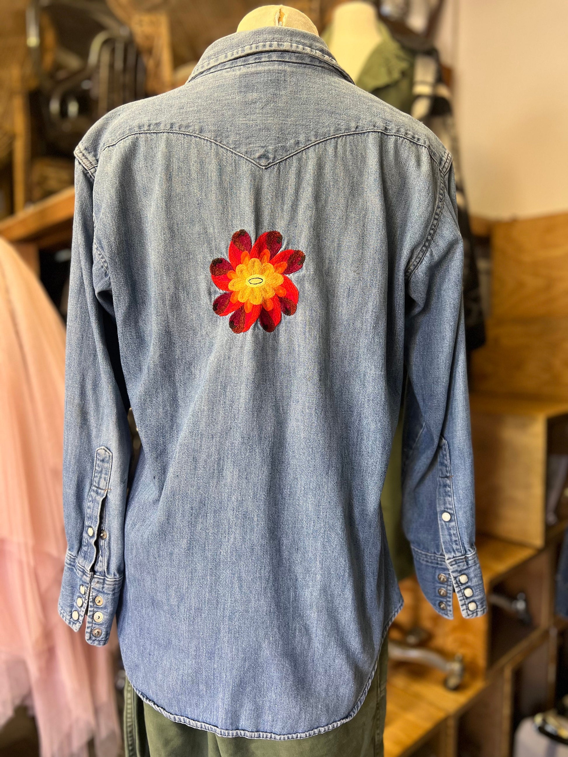 Vintage Sanforized pearl snap Wrangler shirt features hand embroidered flower on back. Beautiful wear, soft and thin in great condition. Tag reads Sanforized Extra Long Tails 16-33 and measures 22” pit to pit by 30”
