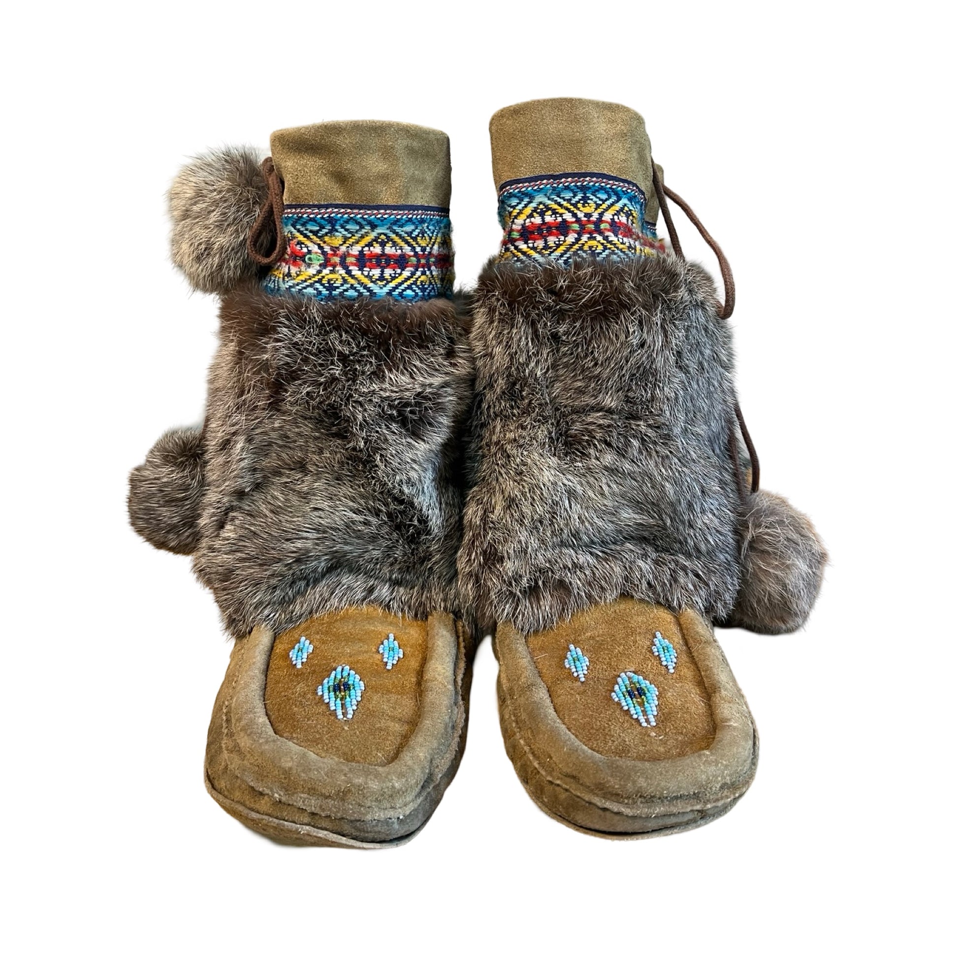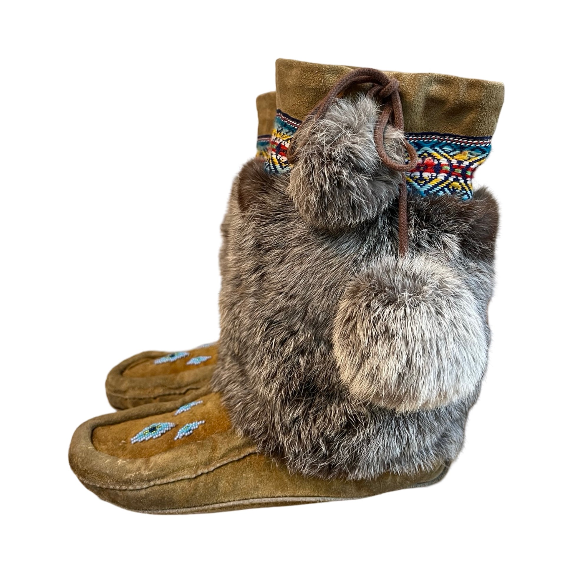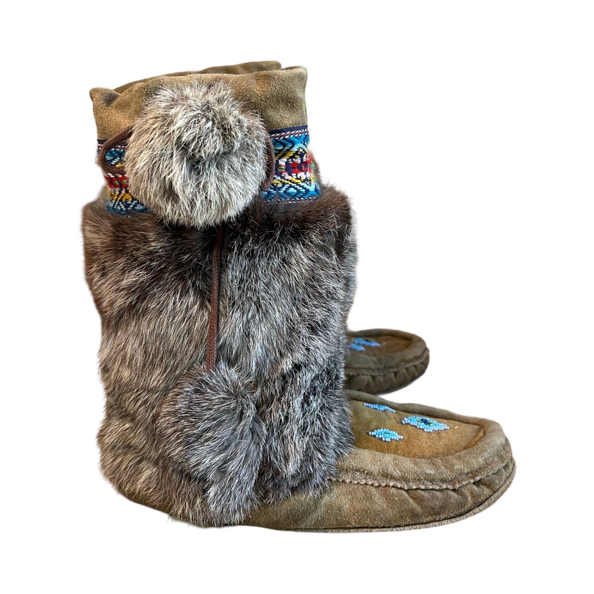 Vintage Suede Moccasin Fur Boots w/ Seed Beading and Side Tie Pom Pom 8/9