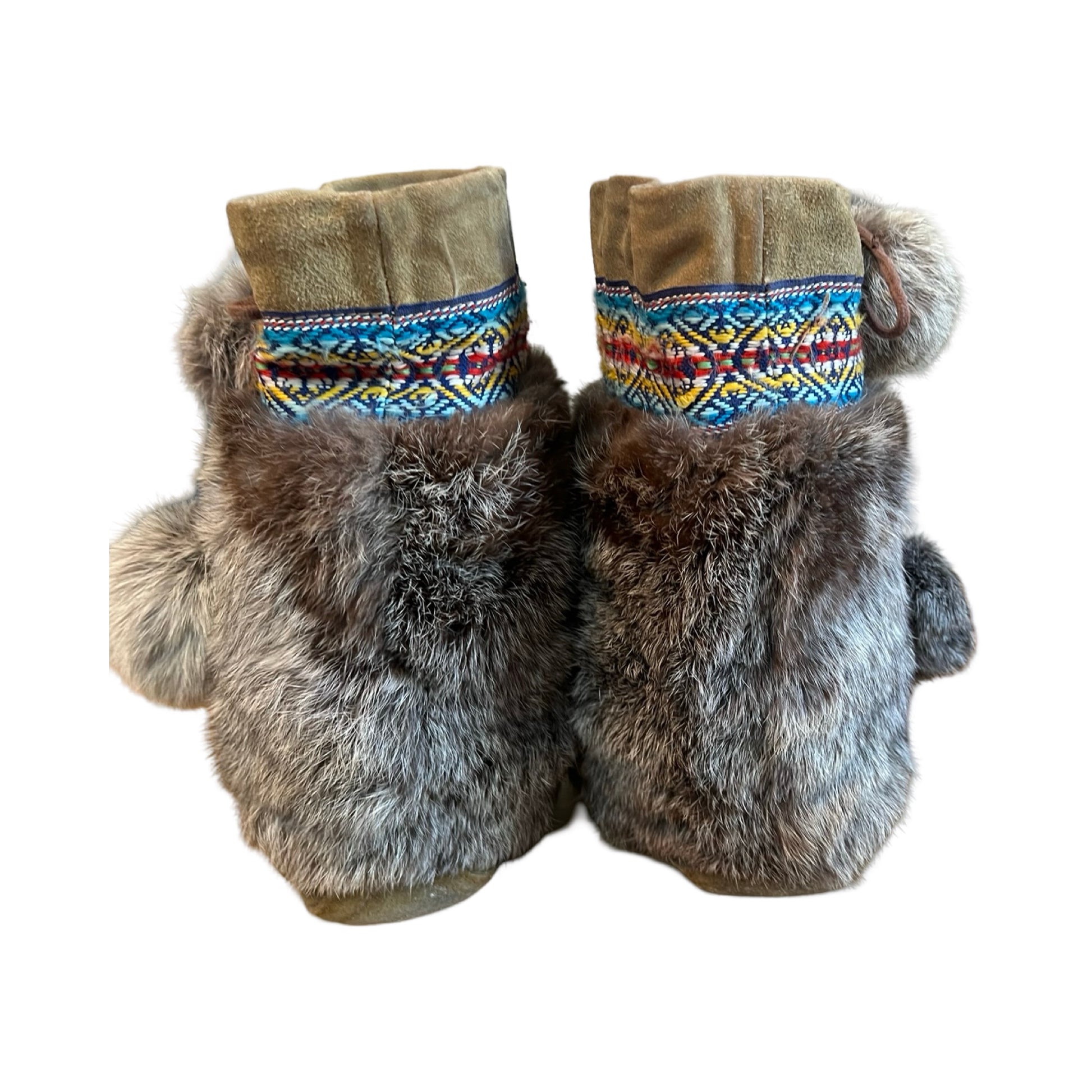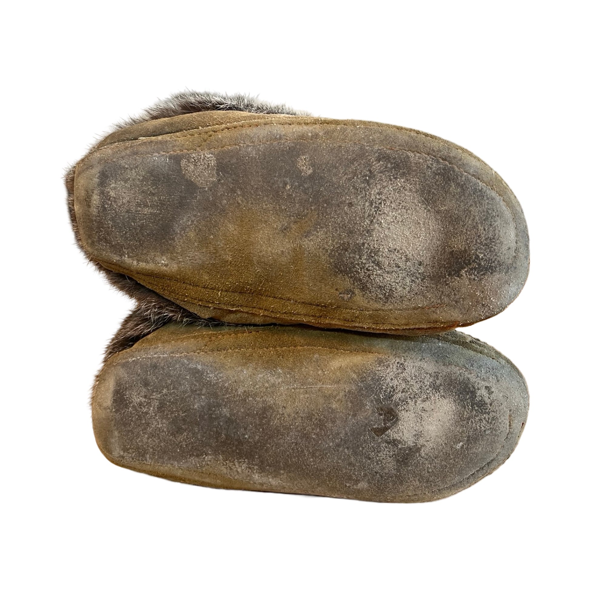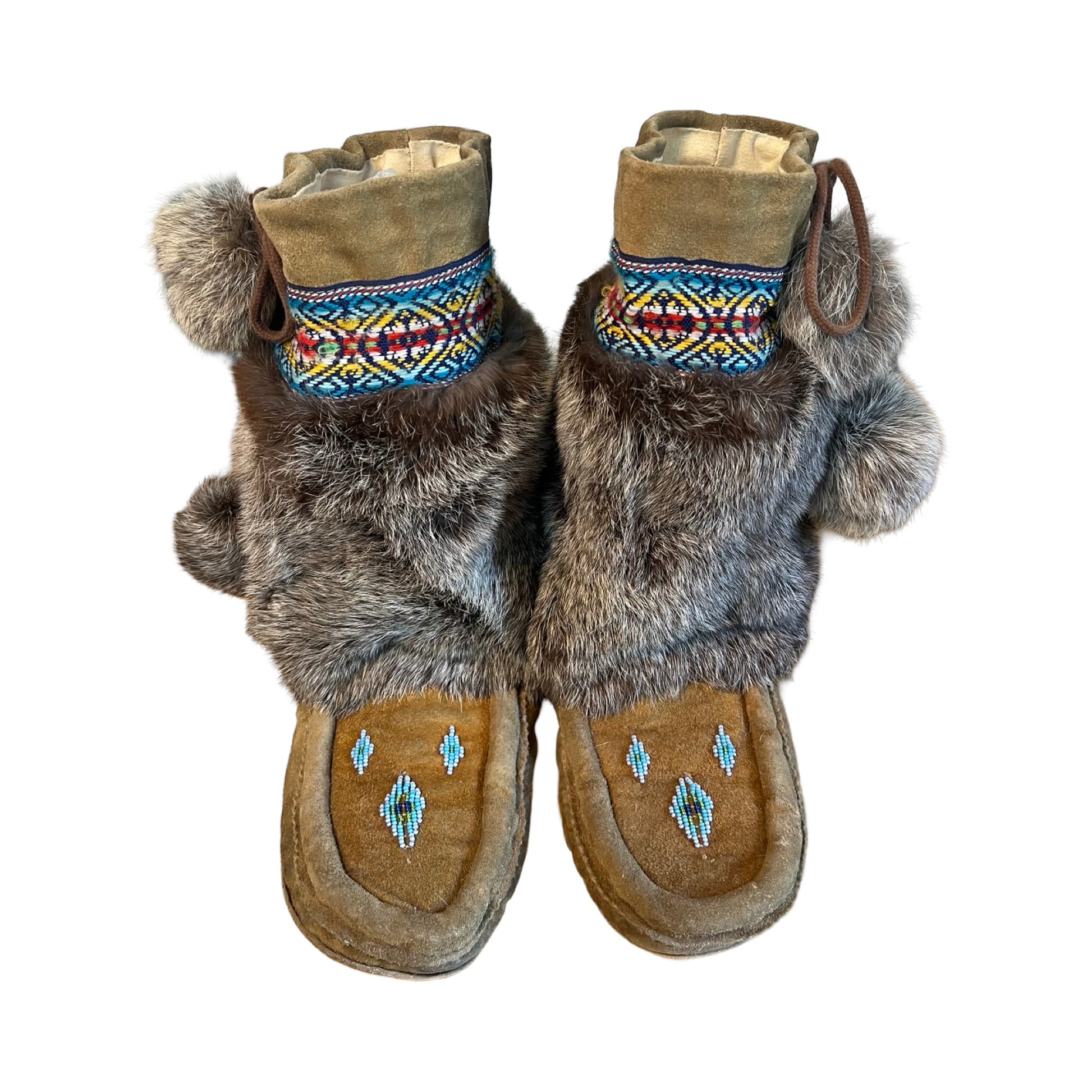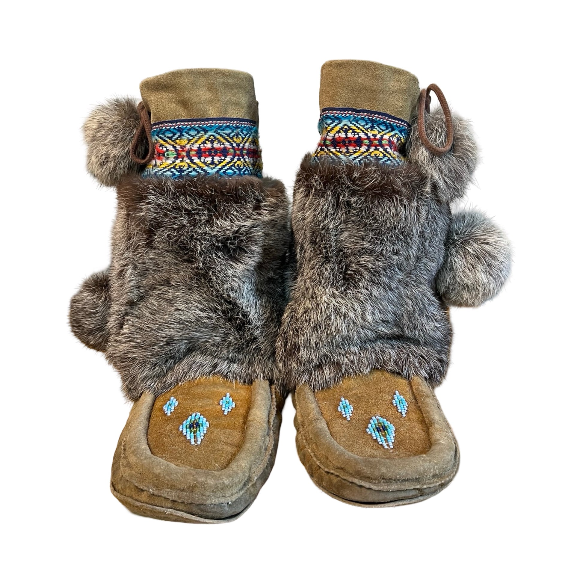 Vintage Suede Moccasin Fur Boots w/ Seed Beading and Side Tie Pom Pom 8/9