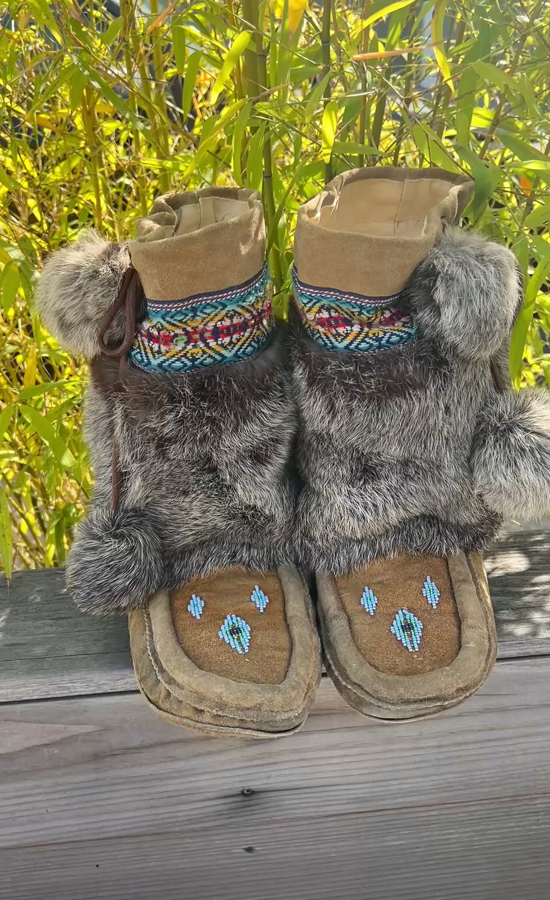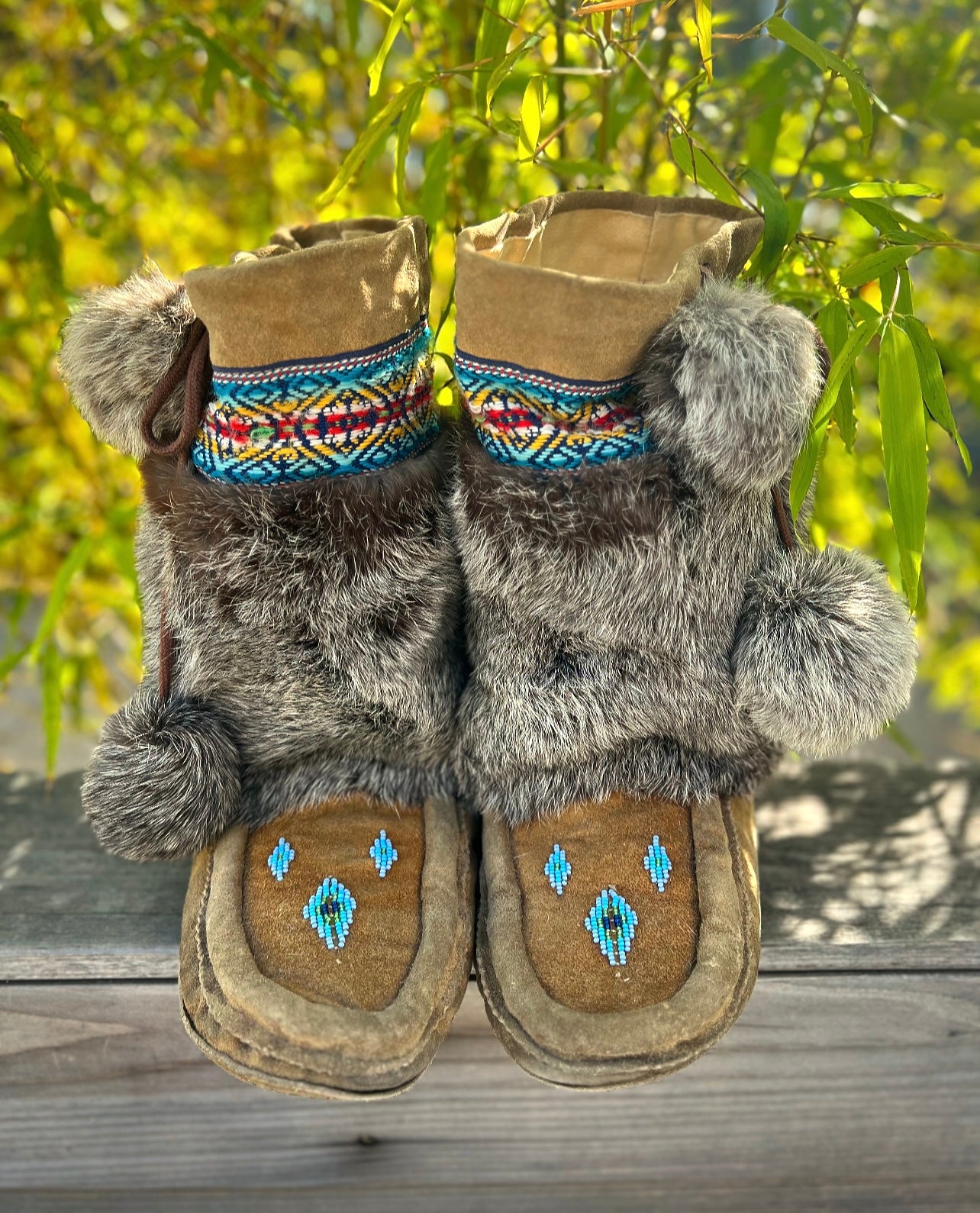 These beautifully worn vintage moccasin boots feature fur shaft, side tie fur pom poms, and native american seed beading adornments. Approximately women’s size 8 to 9, sole measures 11” toe to heel. Lots of wear but a ton of life left in these gorgeous boots! So cozy :))