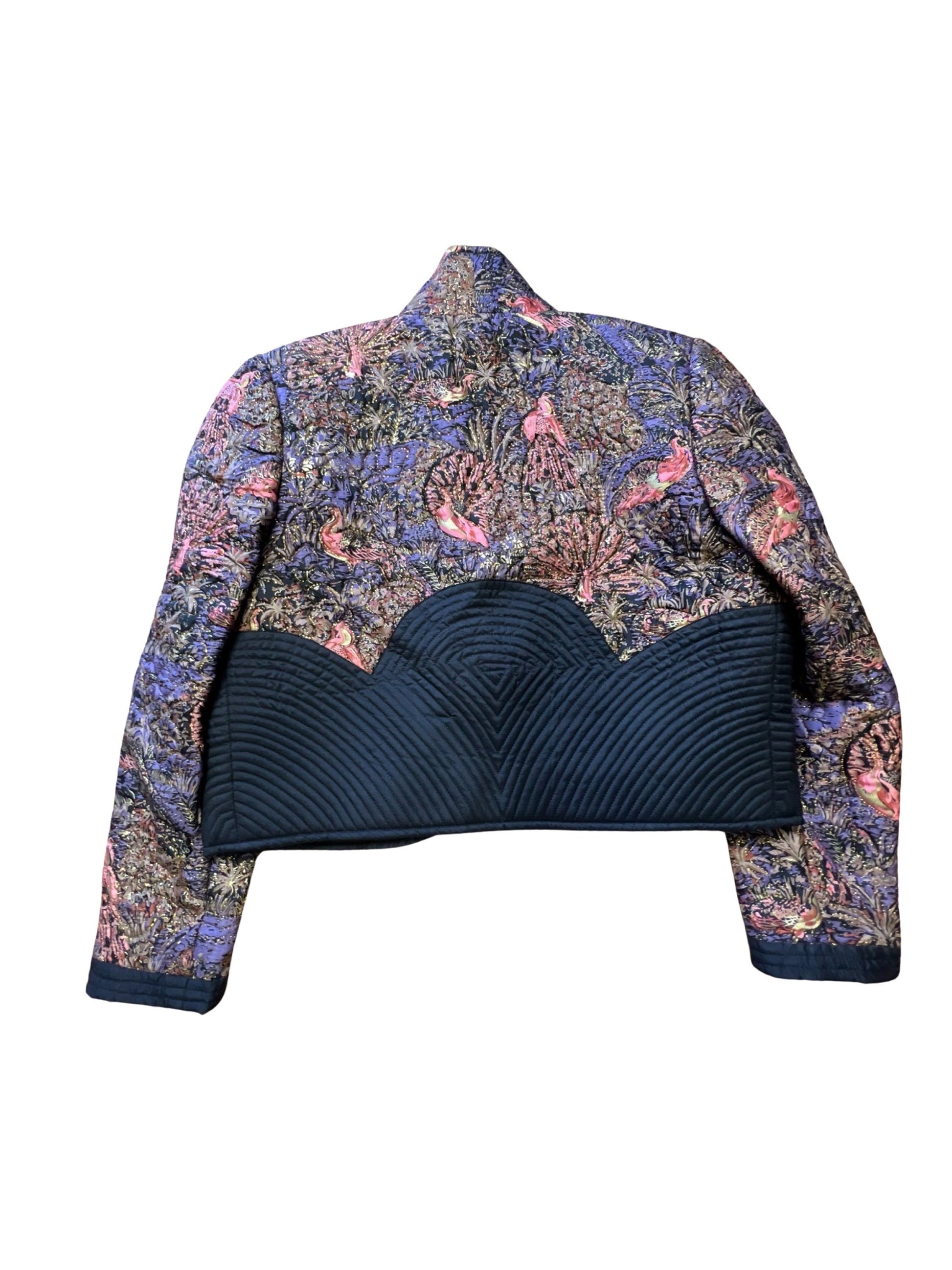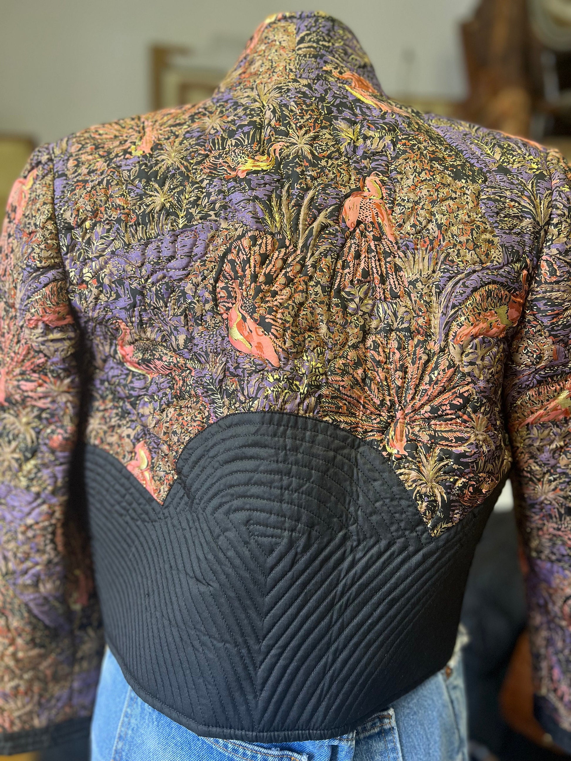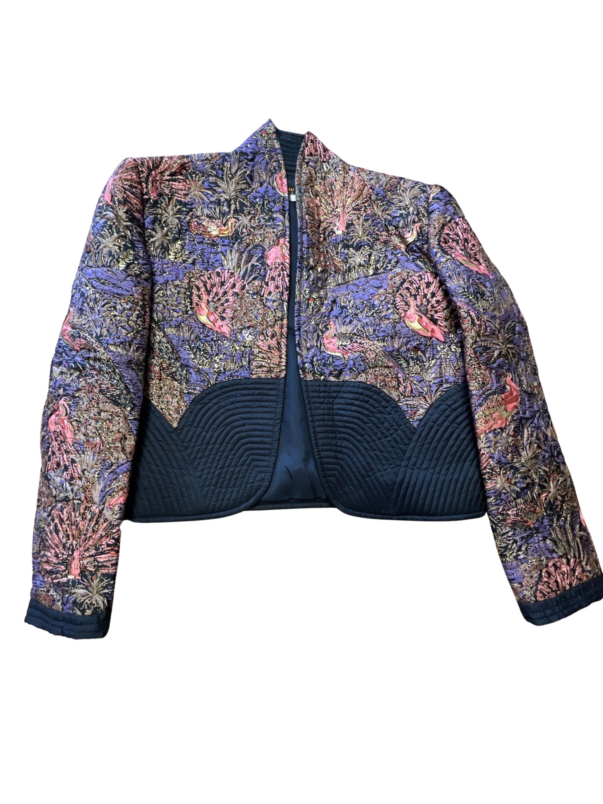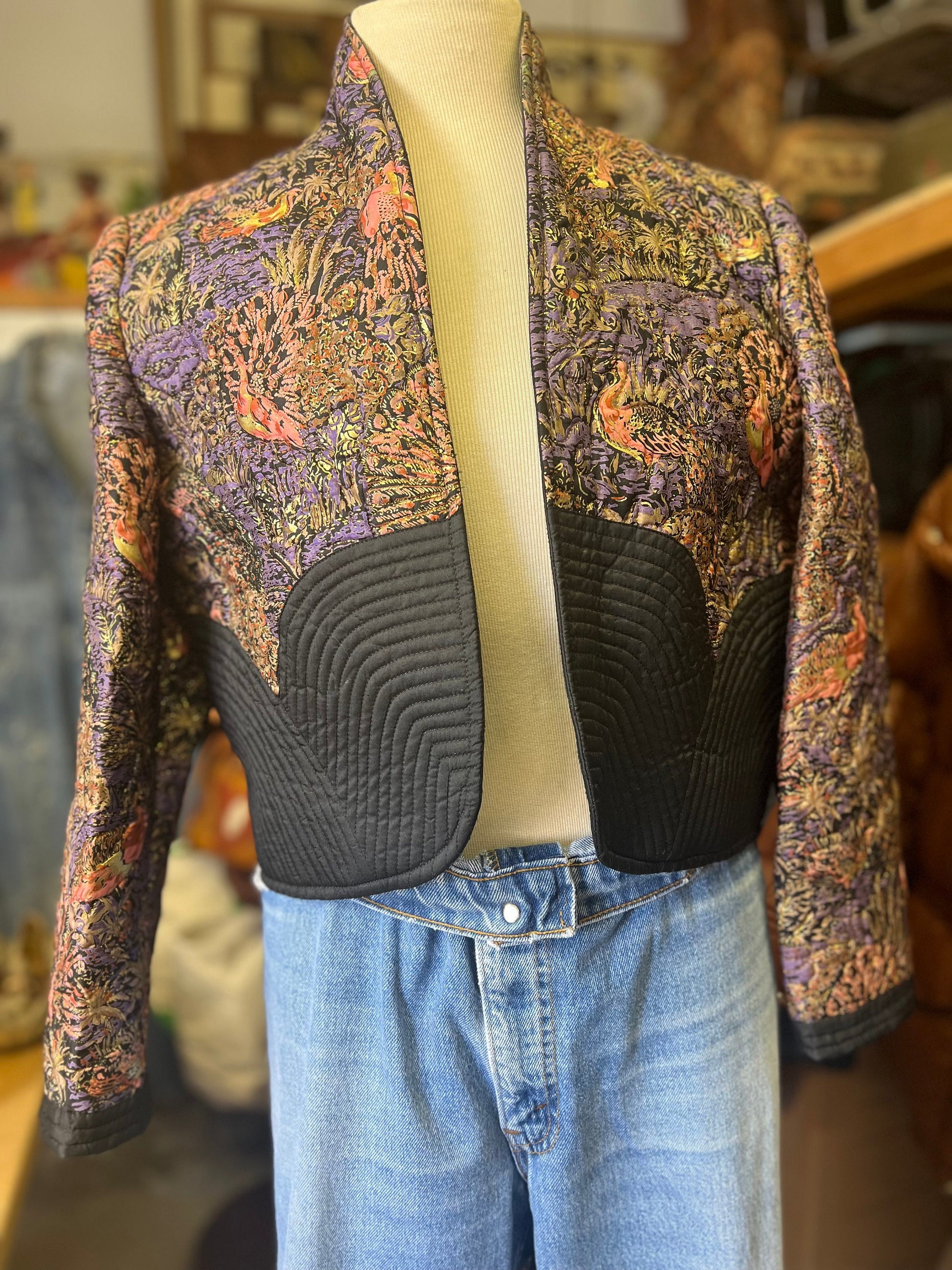 Vintage Thai Silk Quilted Crop Jacket Peacock Floral Motif Gold Lurex Accents