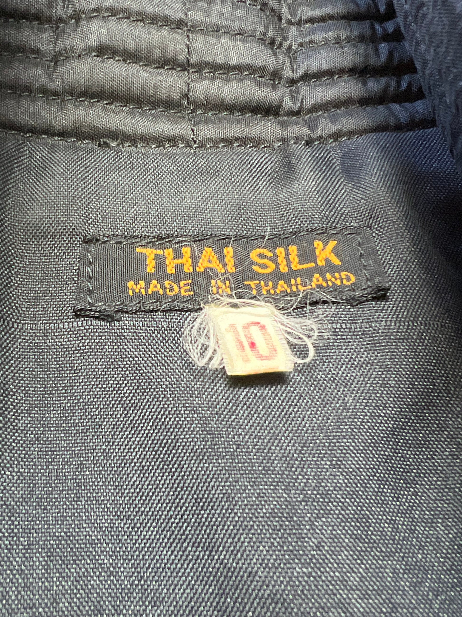 This amazing vintage Thai Silk quilted puffy cropped jacket features a peacocks and floral print, gold lurex threads throughout, no front closures and appears to have never been worn! Tag reads Thai Silk size 10 and measures 16.75” shoulder to shoulder, 21” pit to pit, and 19” back of collar to bottom.