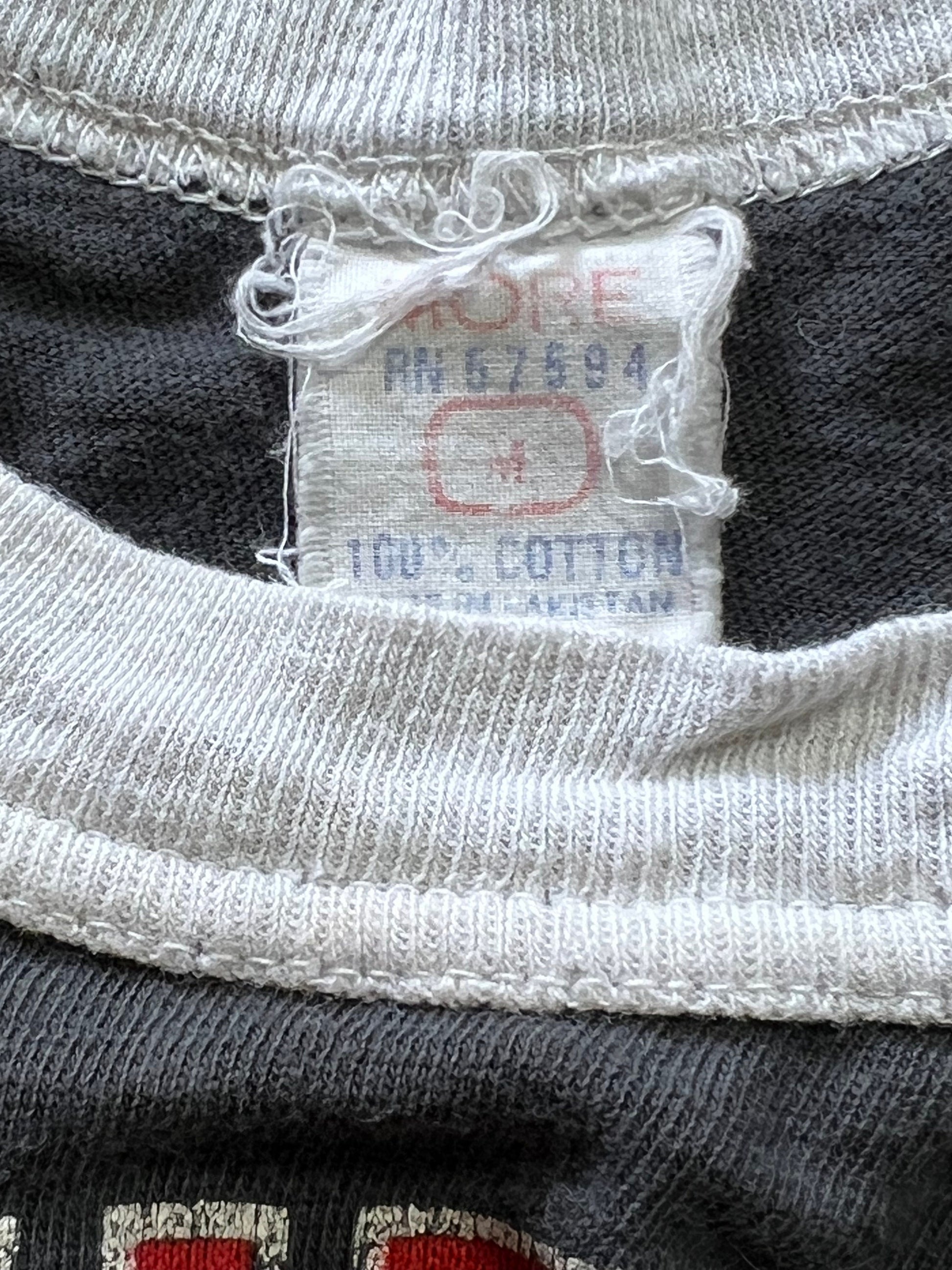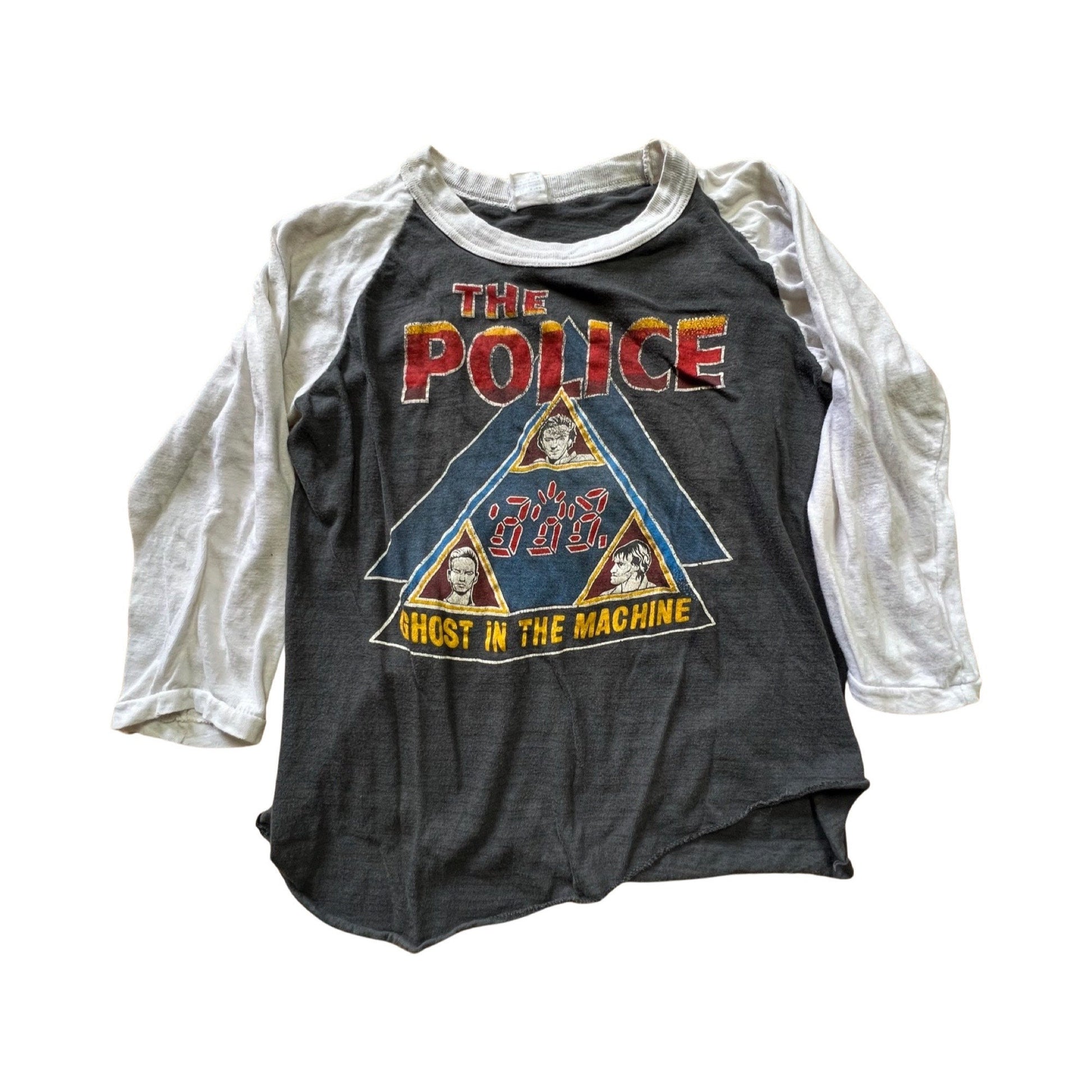 One of my personal faves, this 1982 The Police Ghost In The Machine Tour raglan t is quintessential vintage rock tee perfection. Tag “More” label M measures 17” pit to pit and 20” top to bottom. On the smaller side with a bit of an uneven hem, this shirt is in great vintage condition and a true gem.
