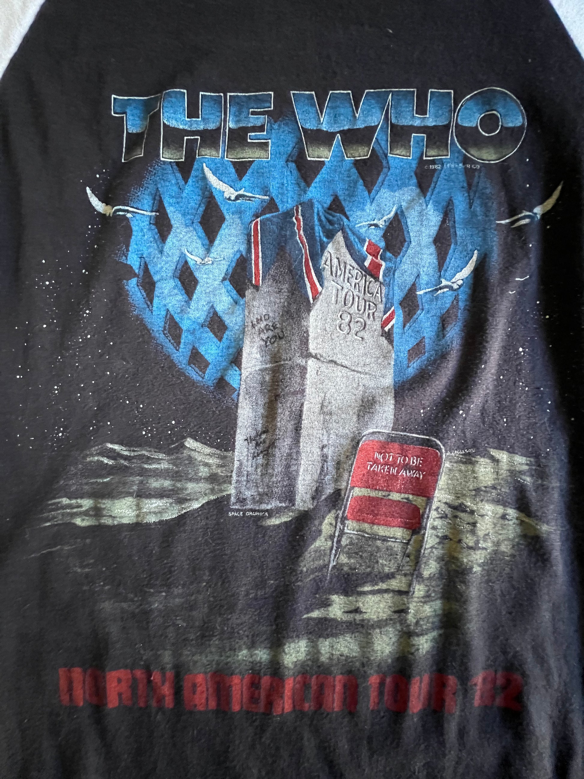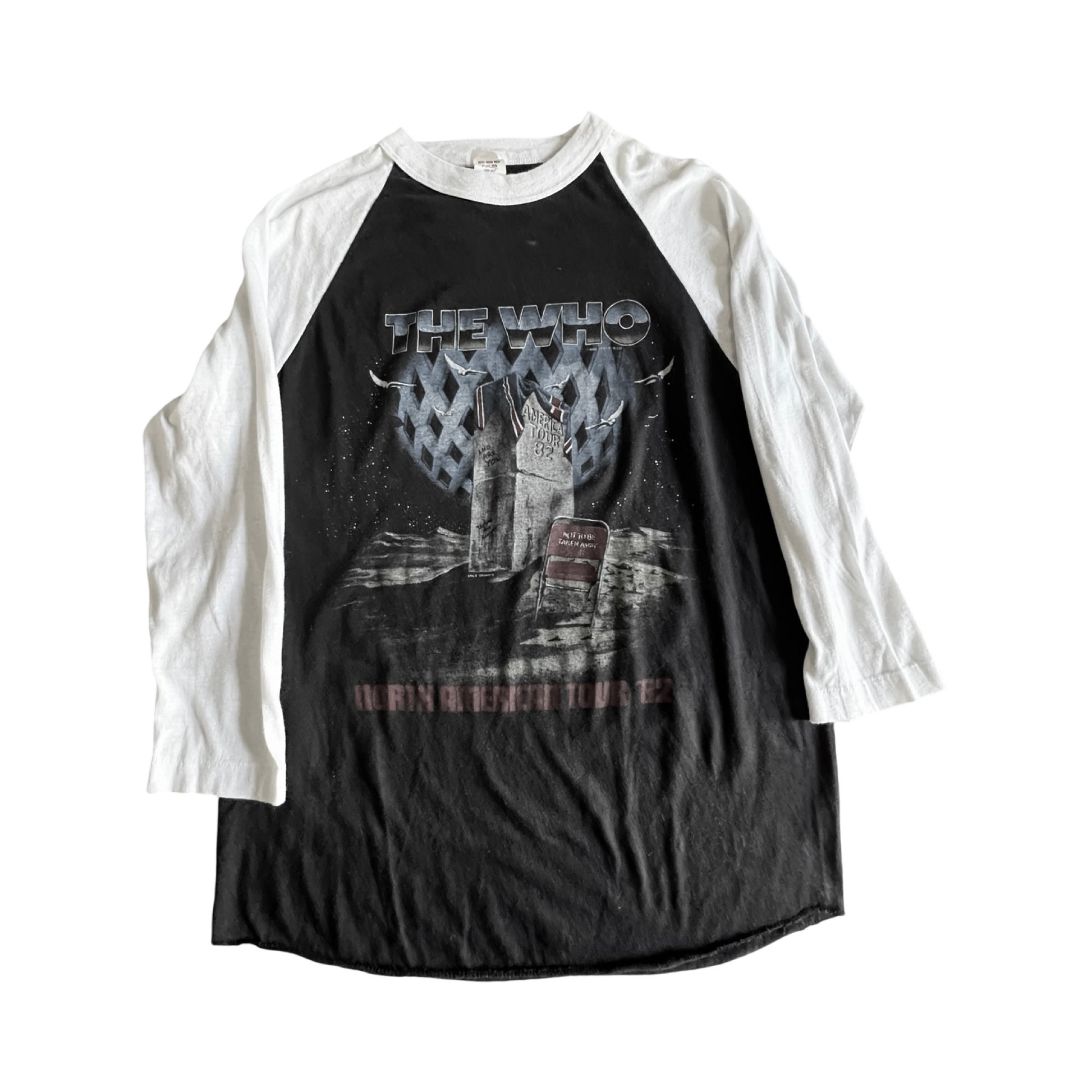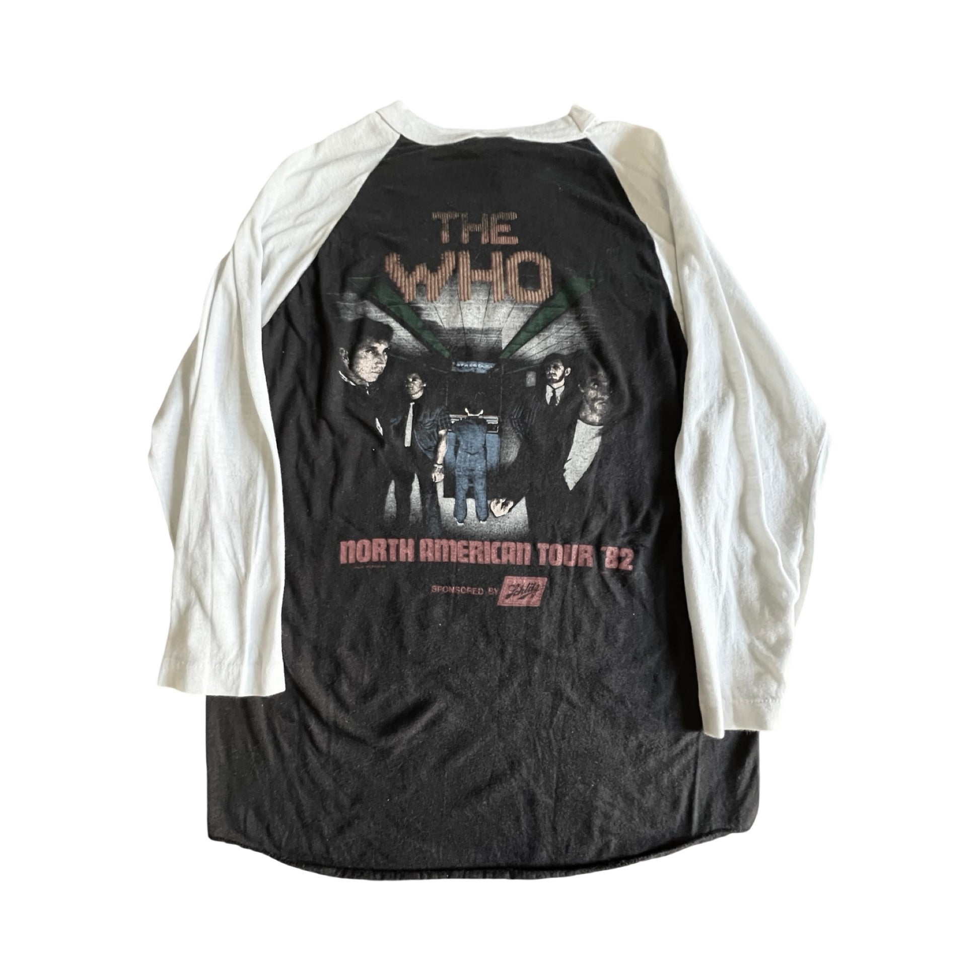 Vintage The Who 1982 North American Tour single stitch raglan sleeve baseball sleeve t-shirt with double sided graphics and raw hem. Soft and thin, Anvil tag size L, shirt measures 18”’pit to pit and 27” top to bottom.