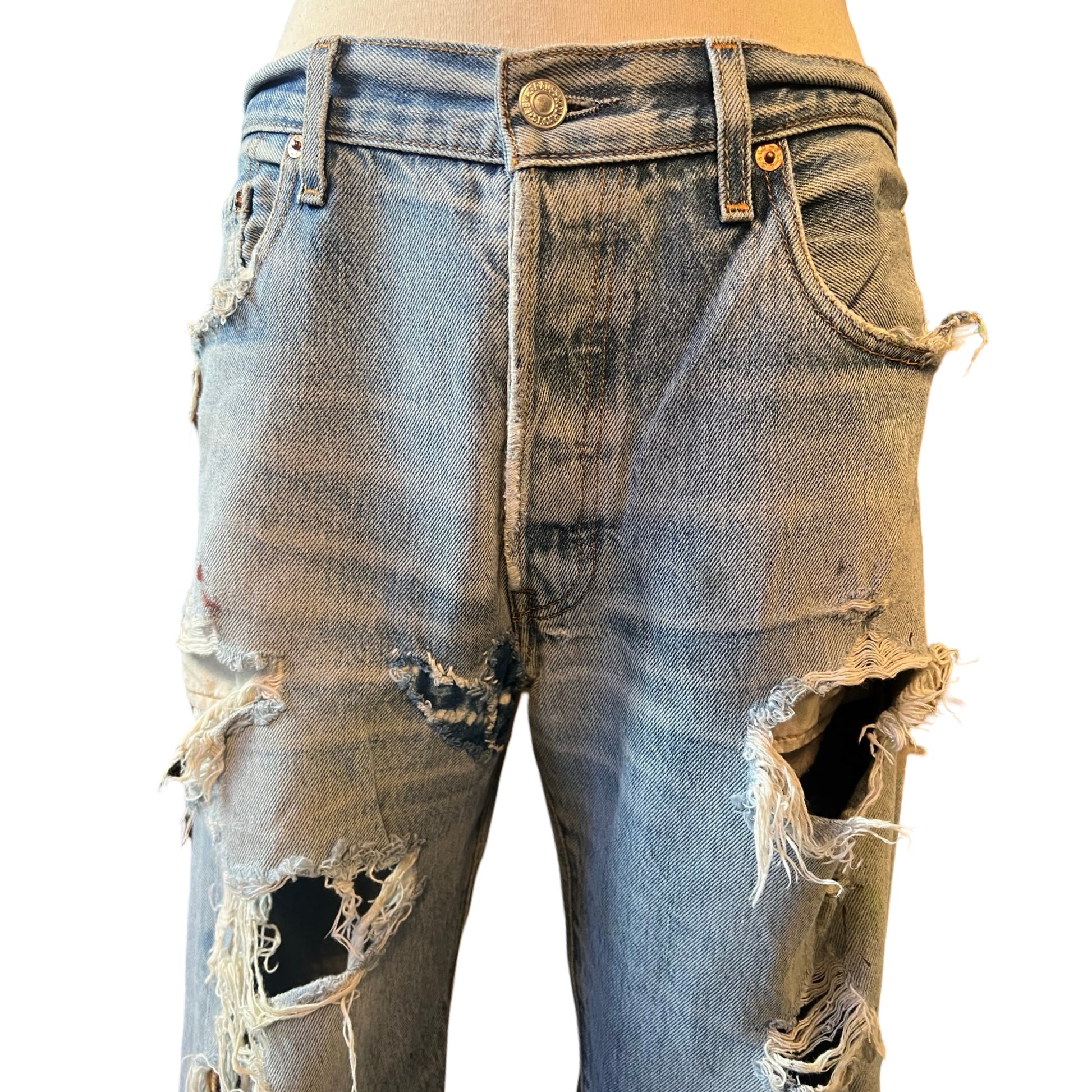 Vintage thrashed Levi’s button fly 501’s. Faded and worn with holes throughout. Measures 17” across the waist with a 31” inseam.