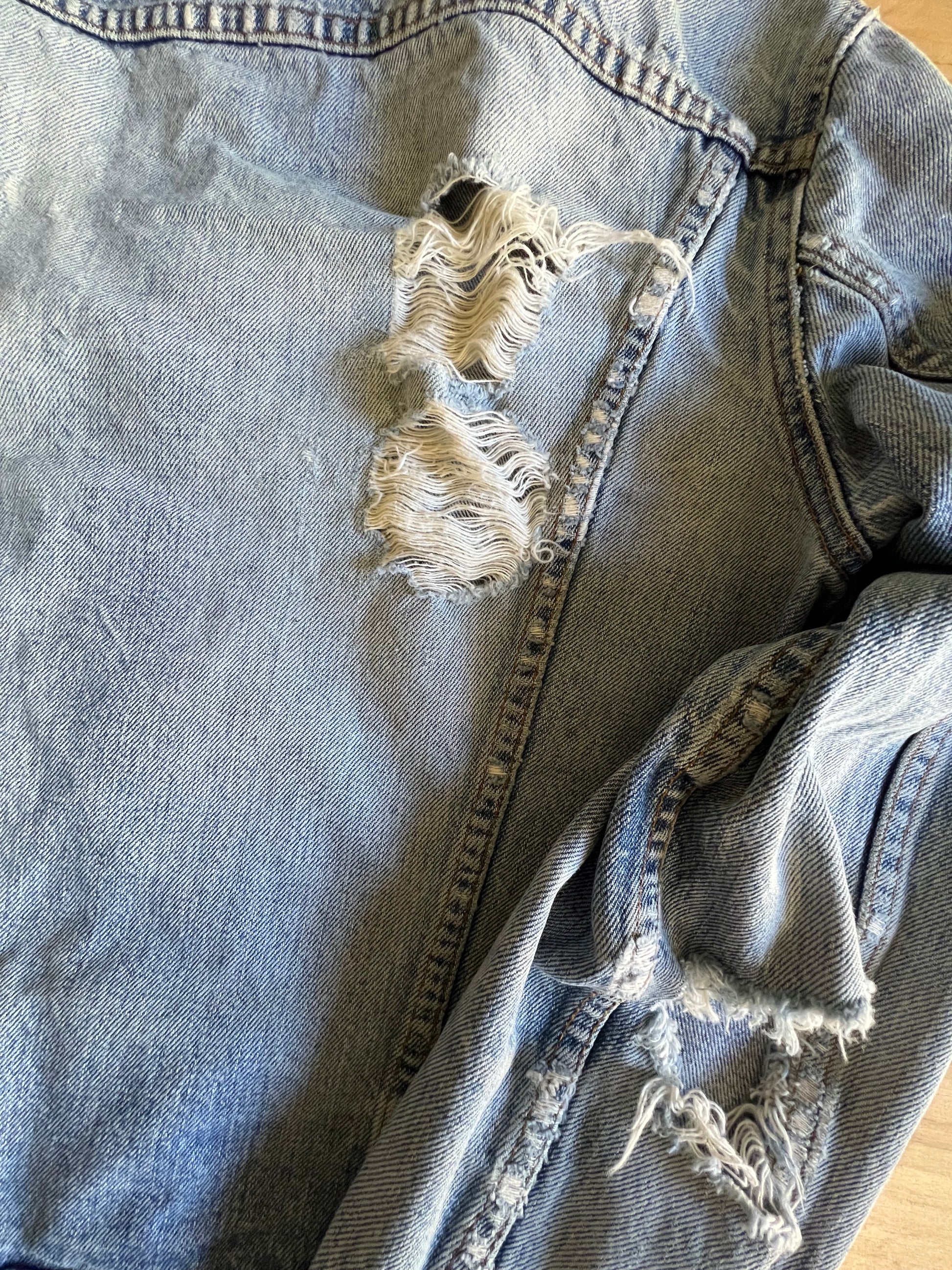 Super thrashed Levi’s denim jacket with all over distressing and holes. Collar is still attached but separated at back of neck. This jacket has been through it! Harley Davidson and United States of America patches are attached but not all the way sewn down. The number 13 has been written in marker on the left cuff. See pics for amount of distressing on this beauty. Measures 18” pit to pit and 22” top to bottom.