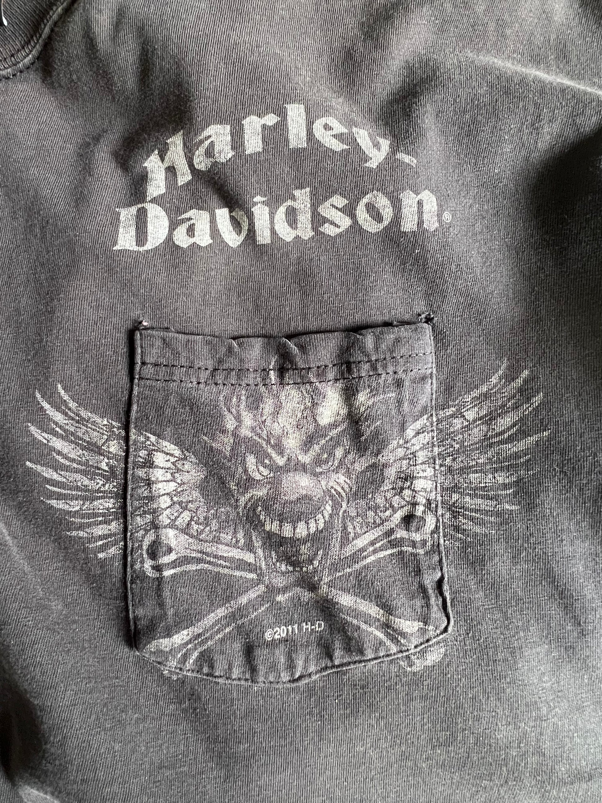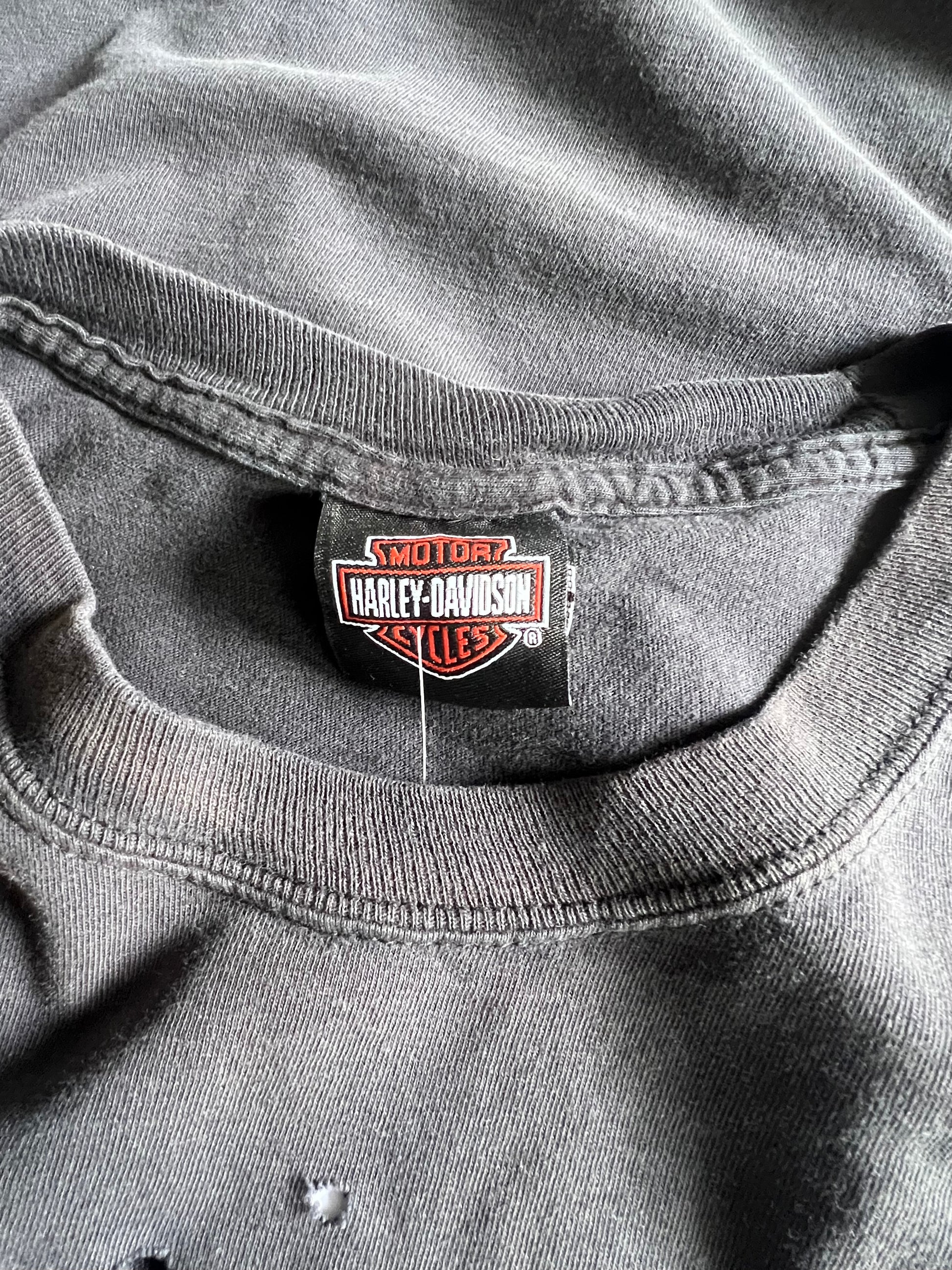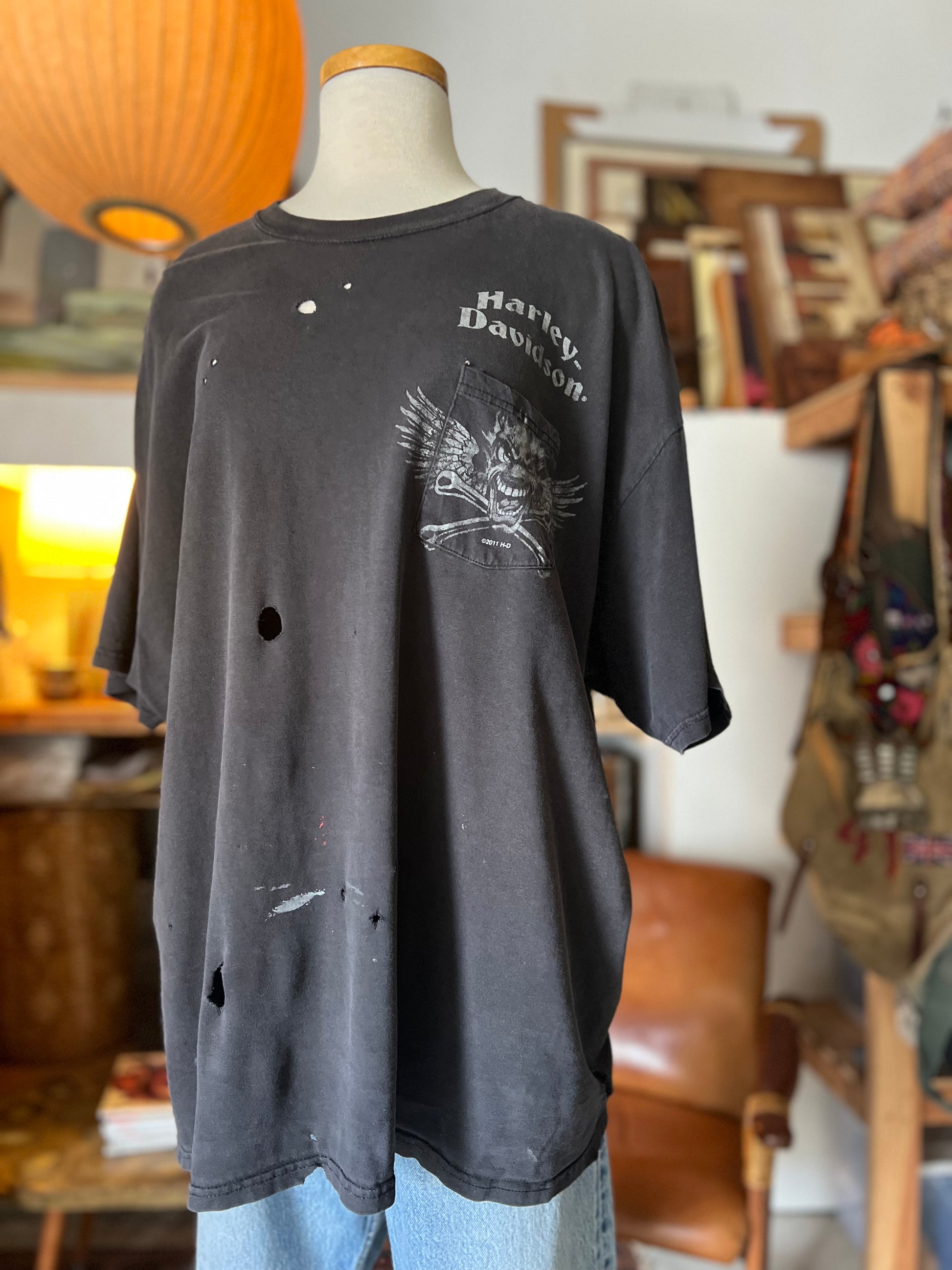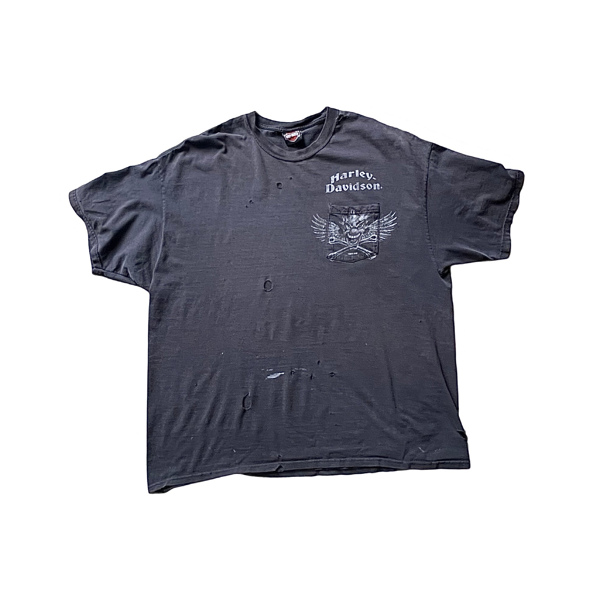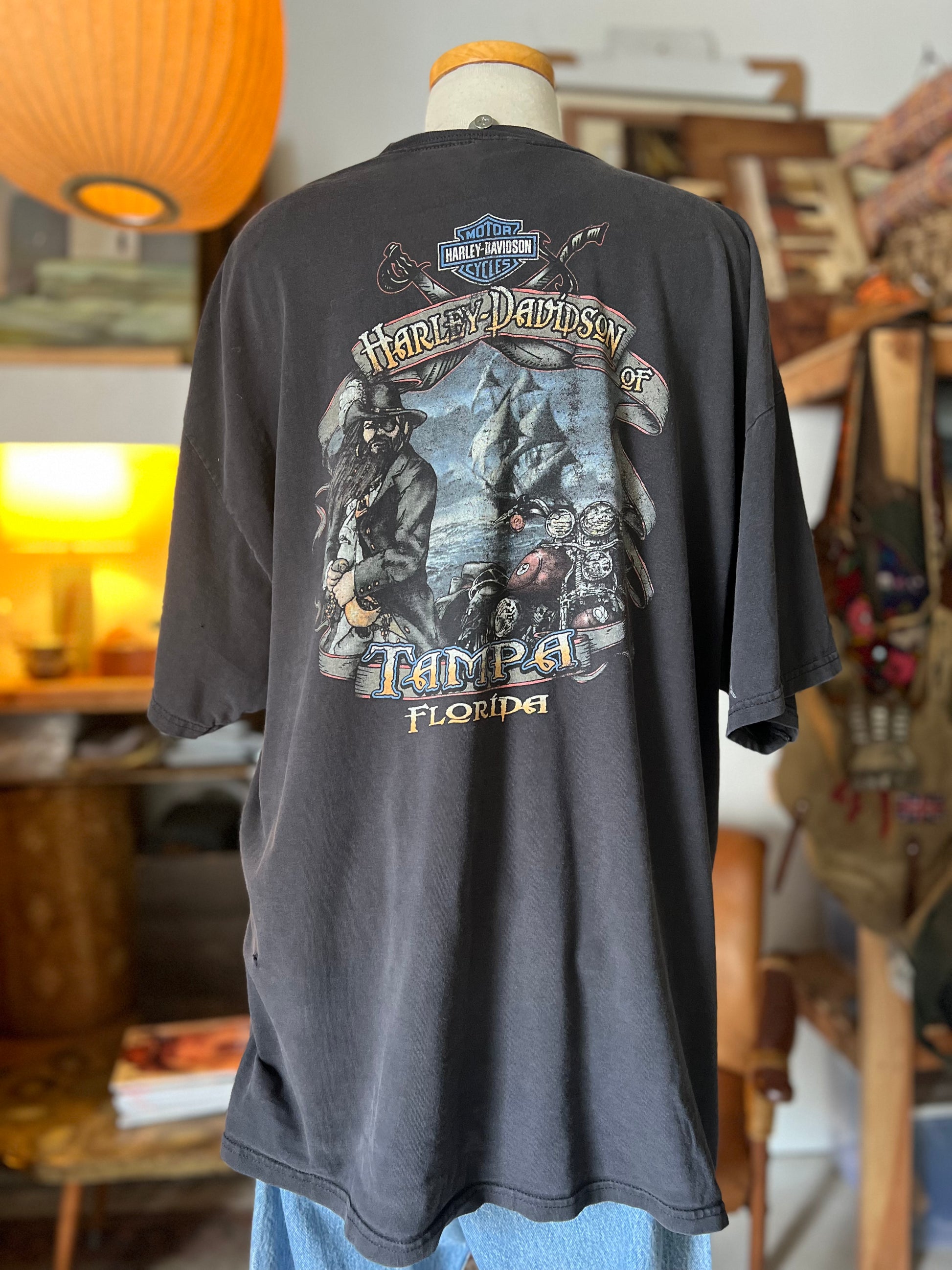 Vintage-ish 2011 Harley Davidson Tampa, FL thrashed distressed t-shirt. Oversized fit, faded graphics, thin and soft with holes and stains throughout. Marked 2XL, measures 26” pit to pit and 29” top to bottom.