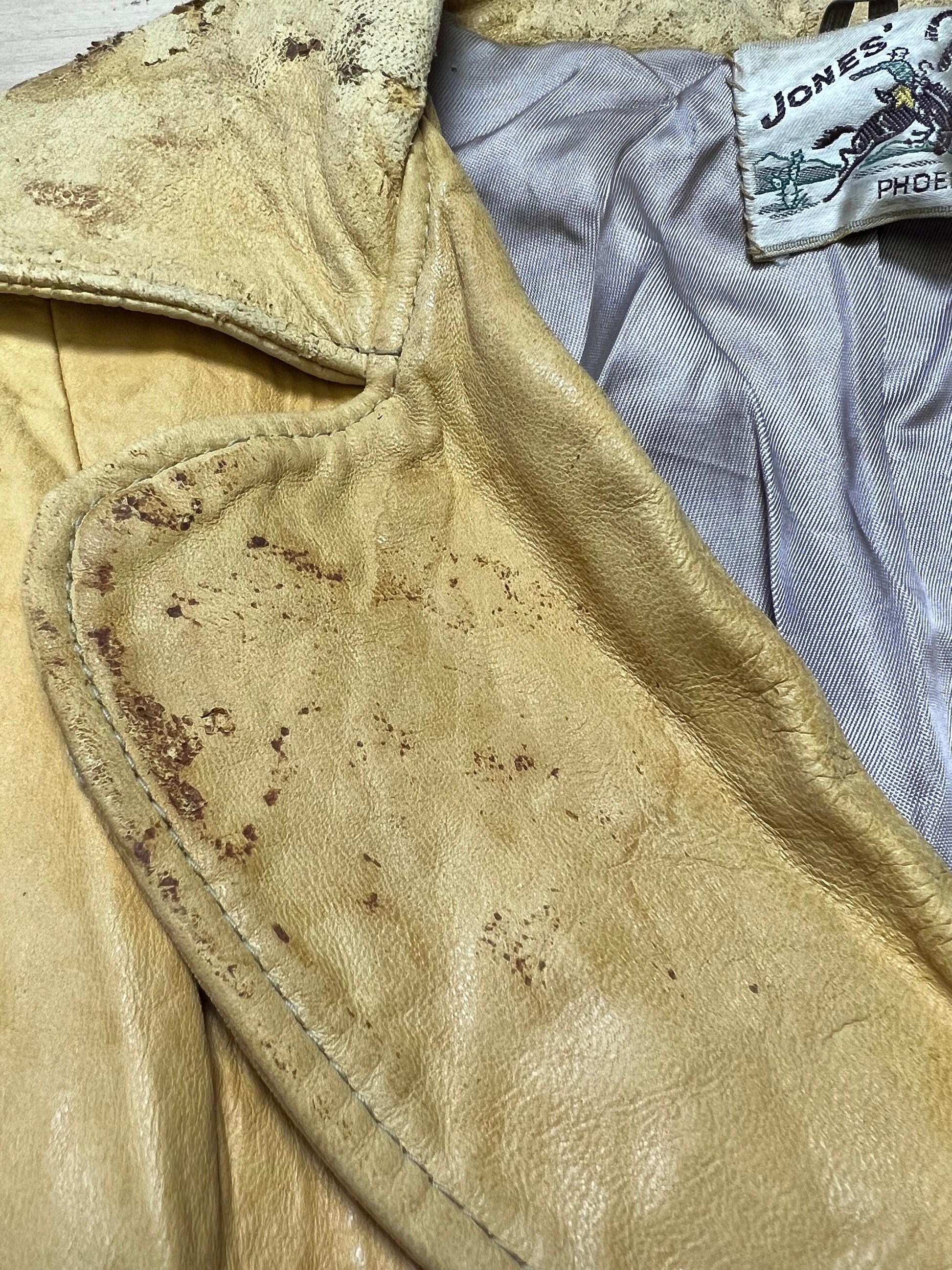 This Jones Western Store Phoenix AZ vintage leather jacket features all over fringe and adjustable silver conchos (they move up and down the fringe and stay in place wherever you want them! She’s got some bruises…a few nicks, a little discoloration, some spots….but the leather is soft and this piece is amazing! Definitely more of a yellow-ish leather as shown in the last 2 pics. Measures 20” pit to pit, 25” base of collar to bottom (29” including fringe).
