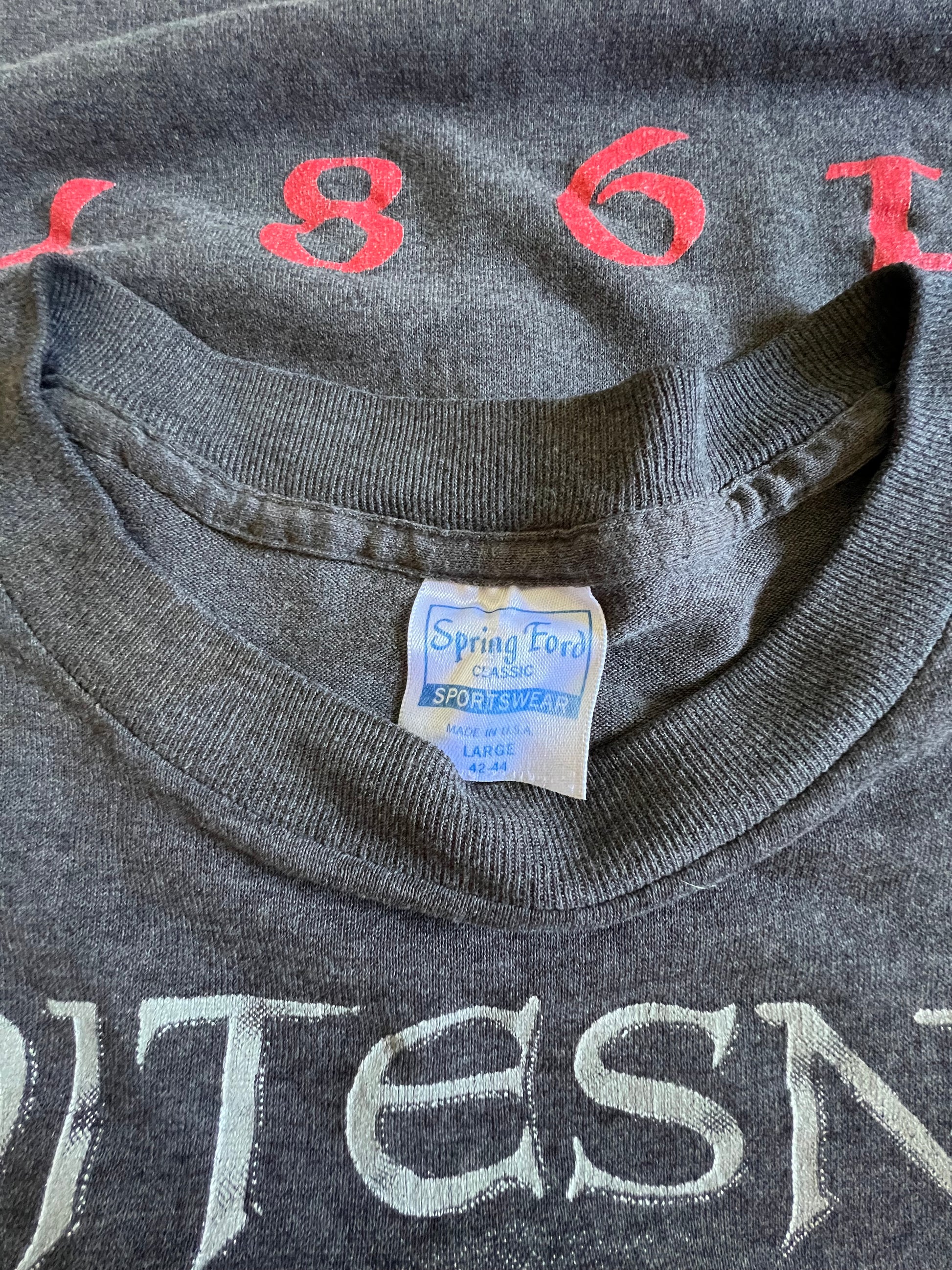 This vintage Whitesnake 1987 tee is super soft and thin and worn to perfection. Single stitch, double sided graphics, some loose threads and discoloration. Spring Ford tag size L, measures 20” pit to pit and 24” top to bottom.